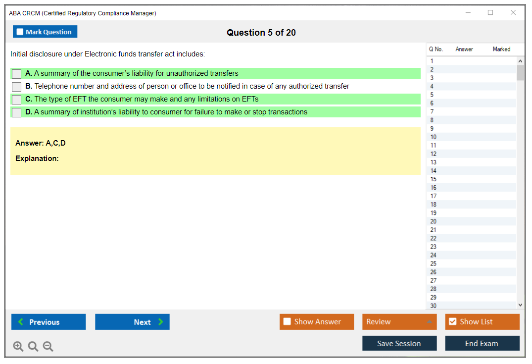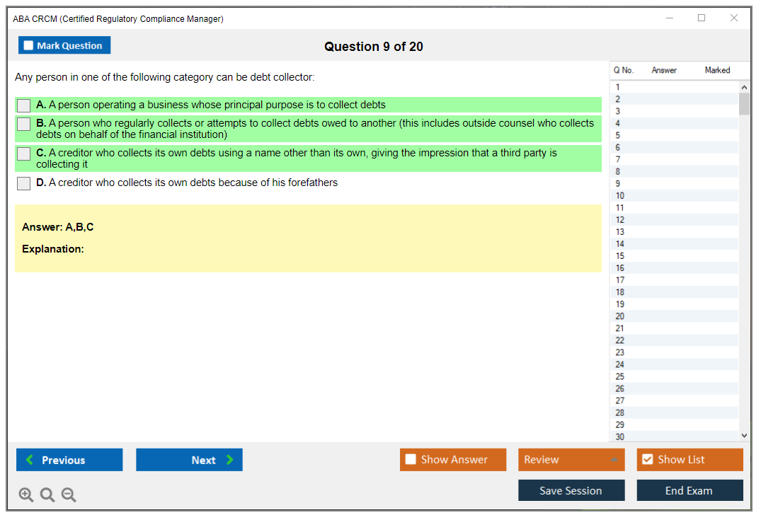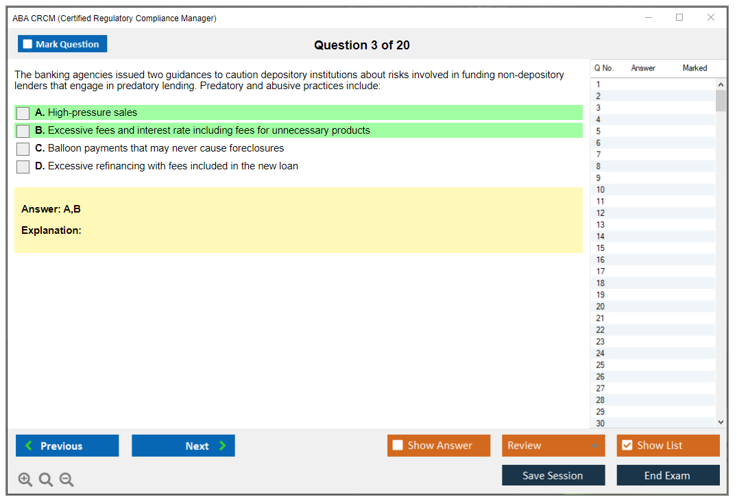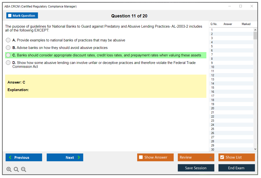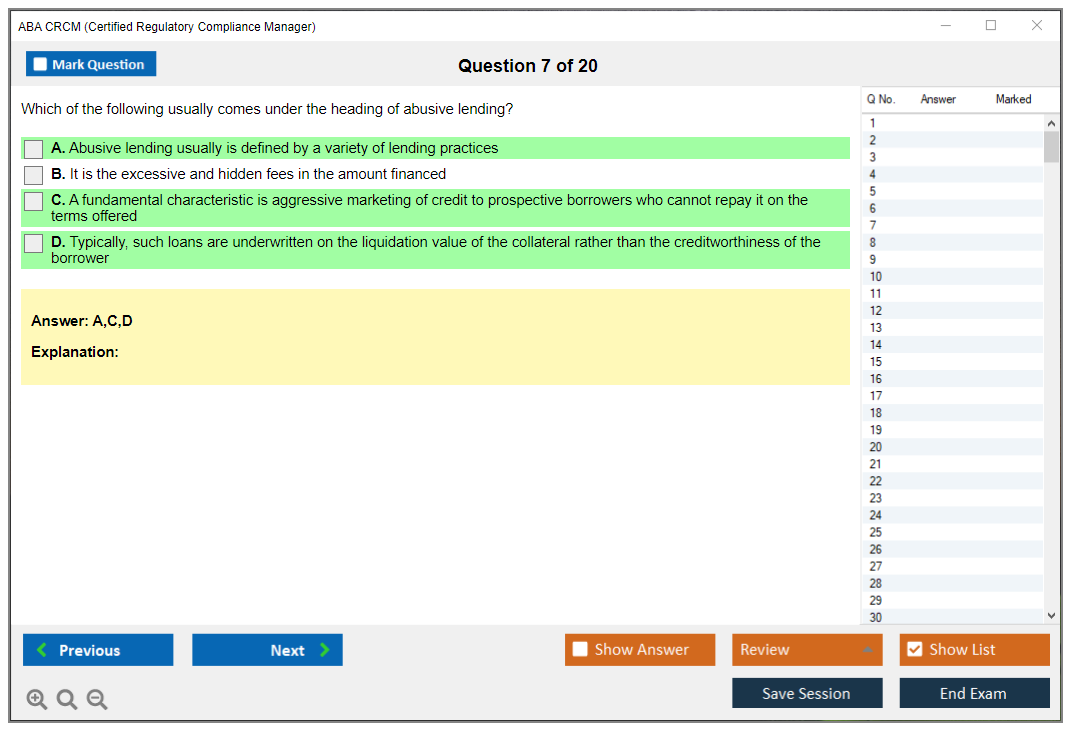 The ABA CRCM (Certified Regulatory Compliance Manager) Exam is a professional certification offered by the American Bankers Association (ABA) for individuals in the banking and financial services industry who specialize in regulatory compliance. It validates their expertise and knowledge in managing compliance risks and adhering to regulatory requirements.