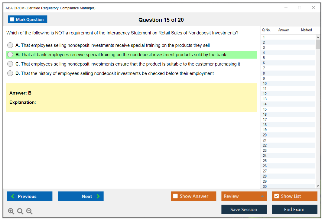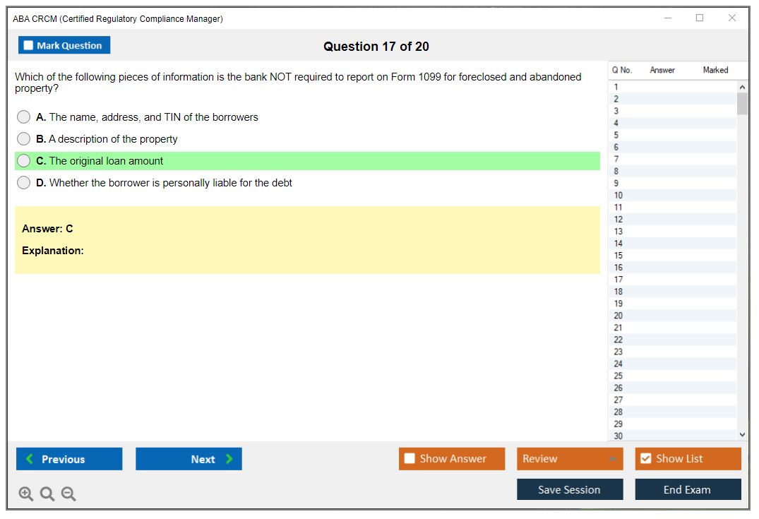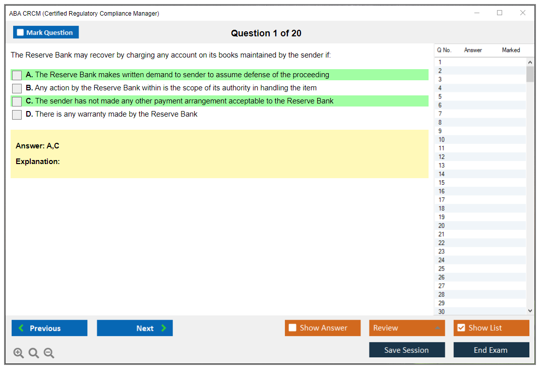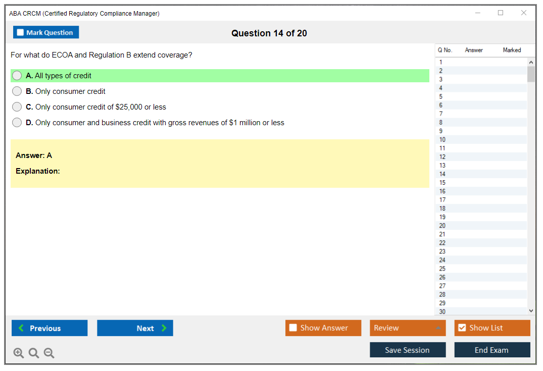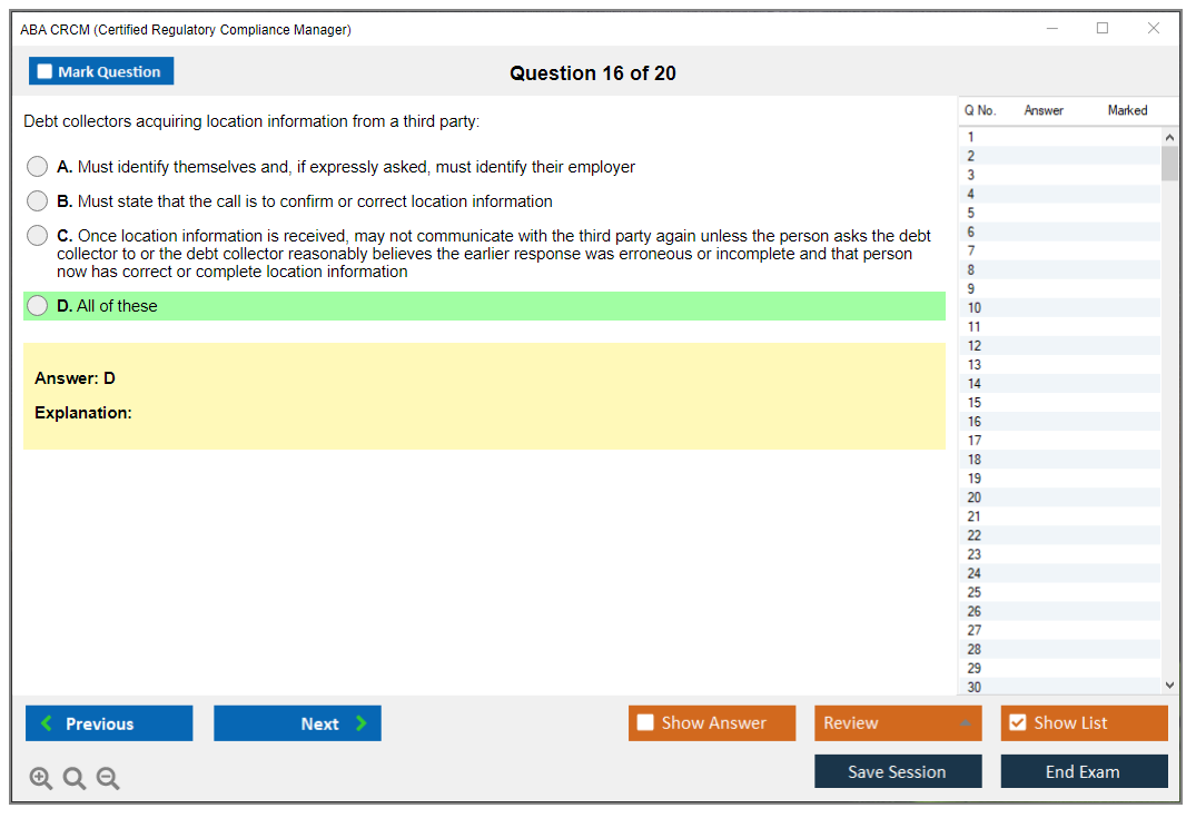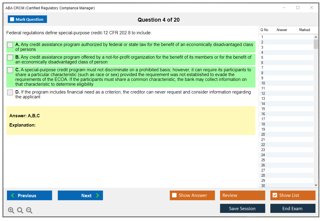 The ABA CRCM (Certified Regulatory Compliance Manager) Exam is a professional certification offered by the American Bankers Association (ABA) for individuals in the banking and financial services industry who specialize in regulatory compliance. It validates their expertise and knowledge in managing compliance risks and adhering to regulatory requirements.