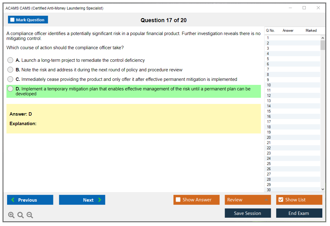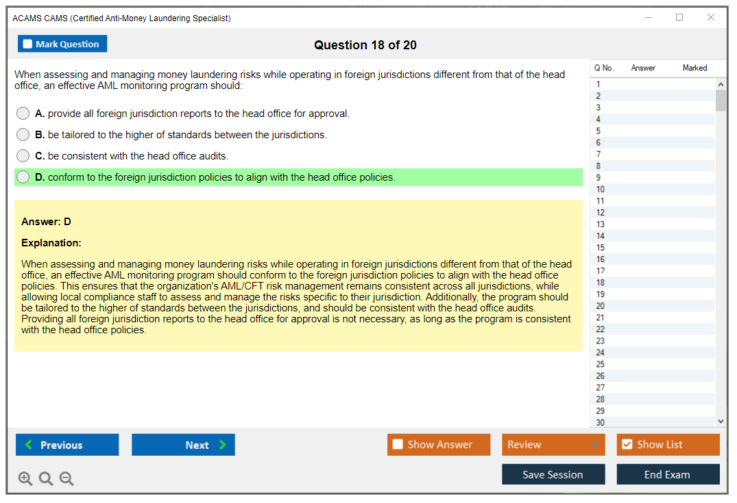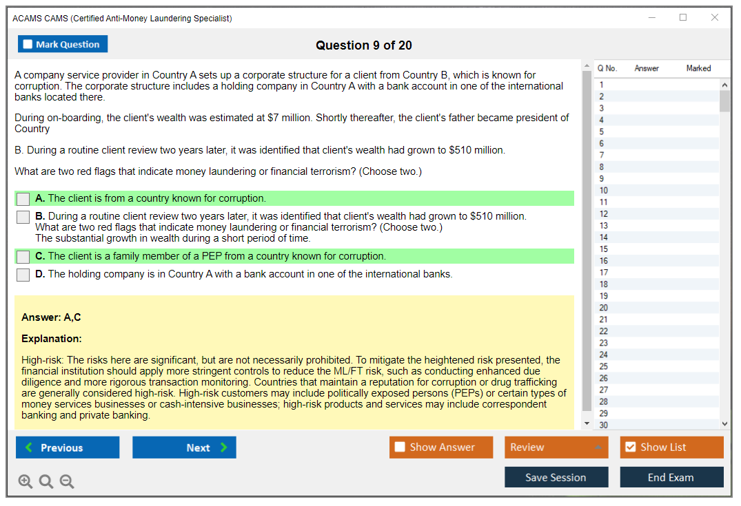 The ACAMS CAMS Exam is designed to assess the knowledge and skills of professionals in the field of anti-money laundering and financial crime prevention. It is a comprehensive test that covers various aspects of AML regulations, practices, and enforcement.