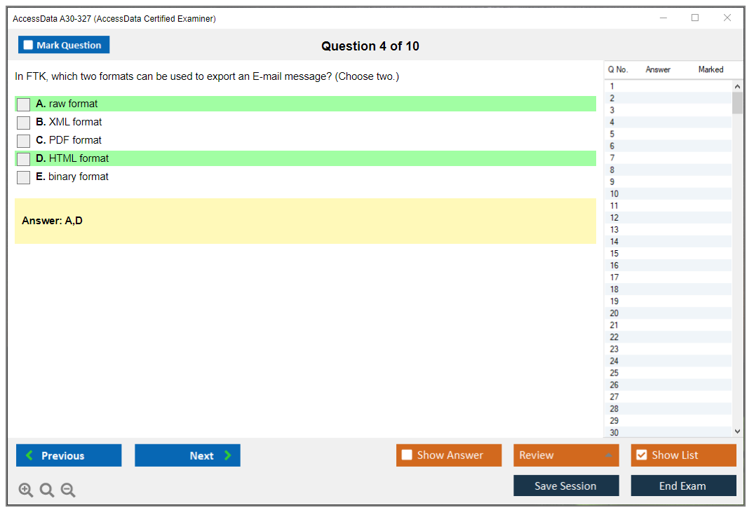 The question format of the AccessData A30-327 exam includes multiple-choice questions, scenario-based questions, and practical exercises.