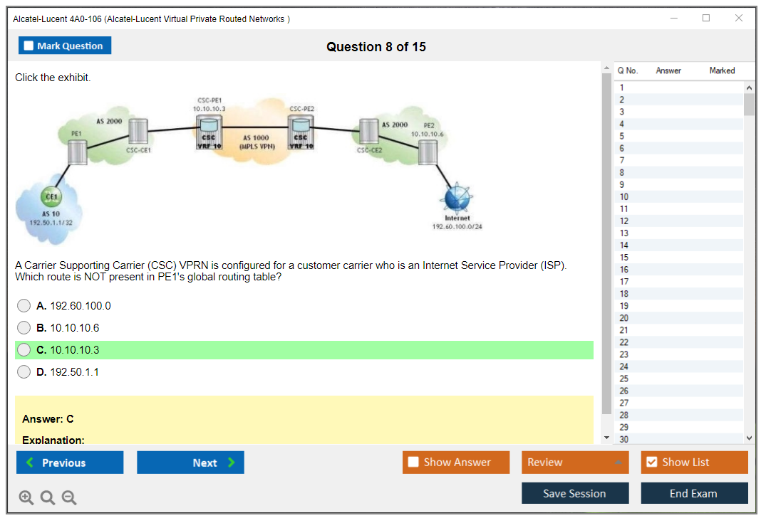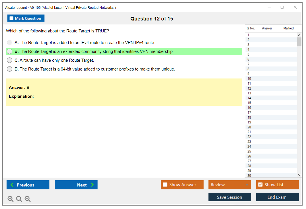 The Alcatel-Lucent 4A0-106 (Nokia Virtual Private Routed Networks) Exam is designed to test a candidate's knowledge and skills in configuring, managing, and troubleshooting Nokia's Virtual Private Routed Networks (VPRN). It is part of the Nokia Service Routing Certification (SRC) program.