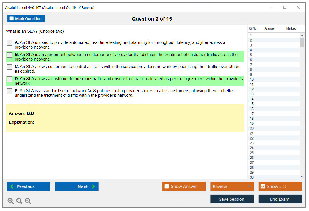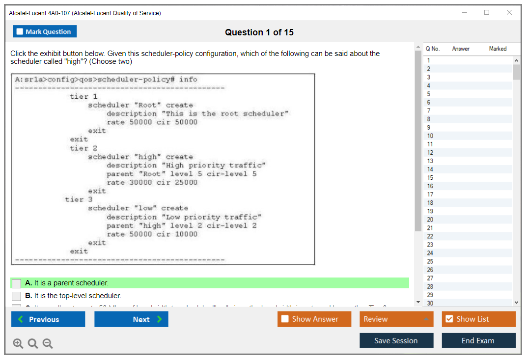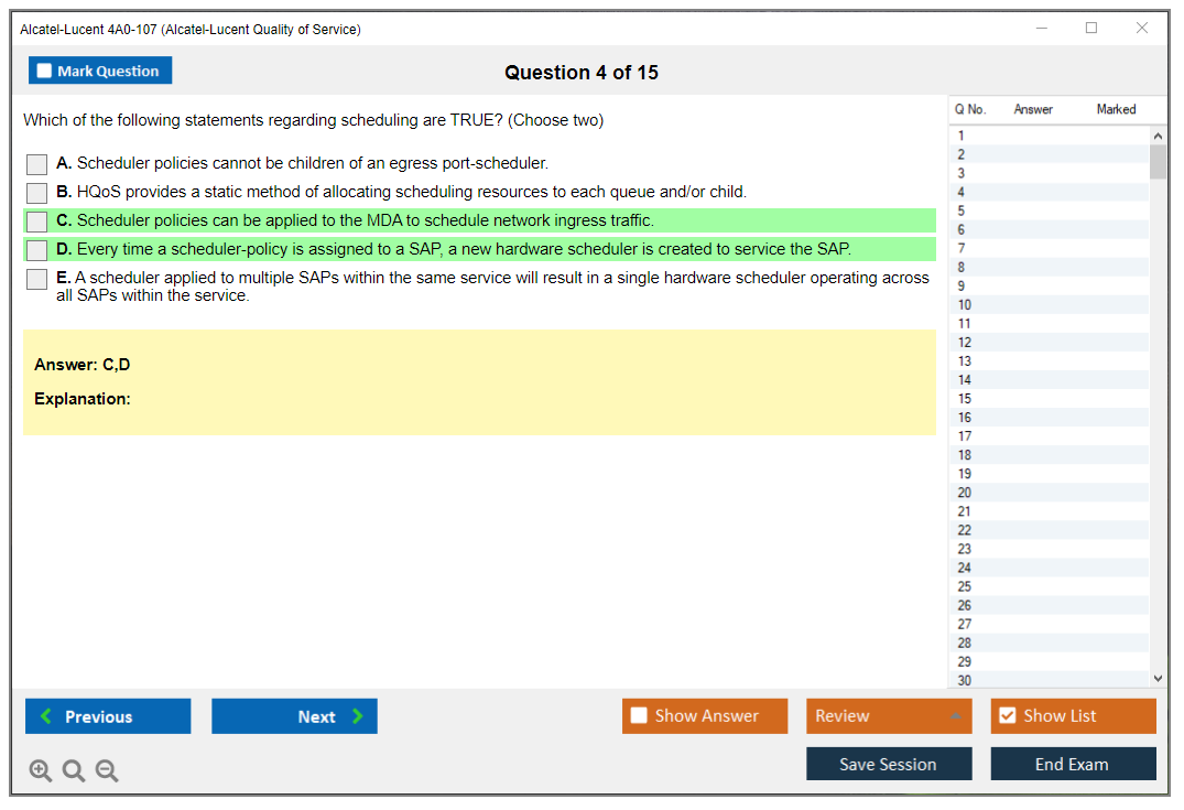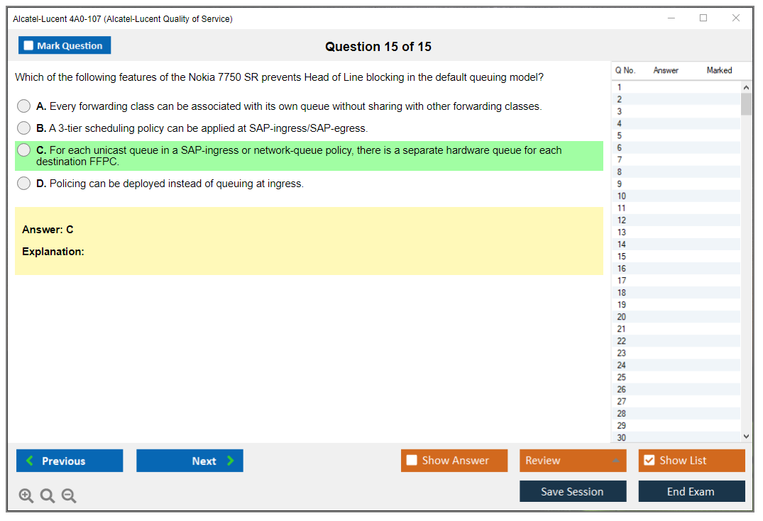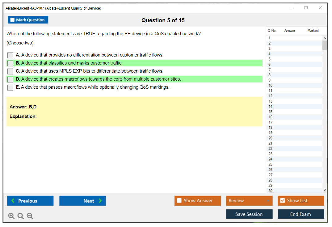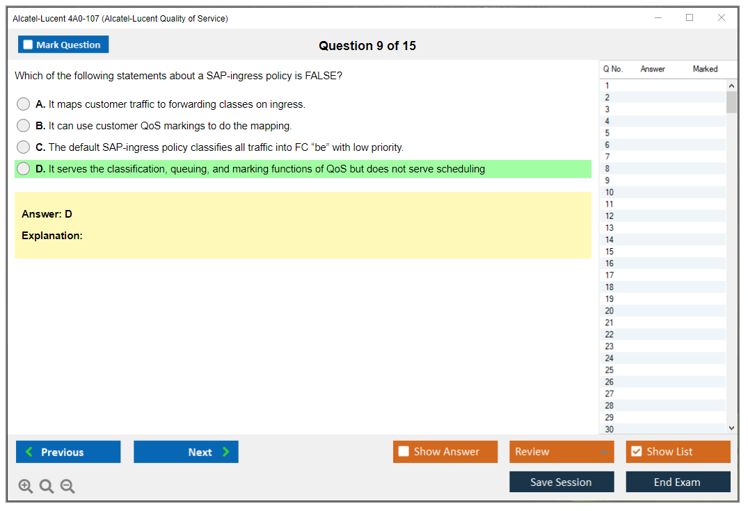The Alcatel-Lucent 4A0-107 (Nokia Quality of Service) Exam is designed to test the knowledge and skills of candidates in implementing and managing quality of service (QoS) in Nokia networks. It is part of the Nokia Service Routing Certification (SRC) program.