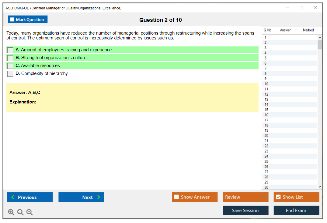 The ASQ CMQ-OE (Certified Manager of Quality/Organizational Excellence) exam is designed to assess the knowledge and skills of individuals in managing quality and organizational excellence. This certification is for professionals who lead and champion process improvement initiatives in organizations.