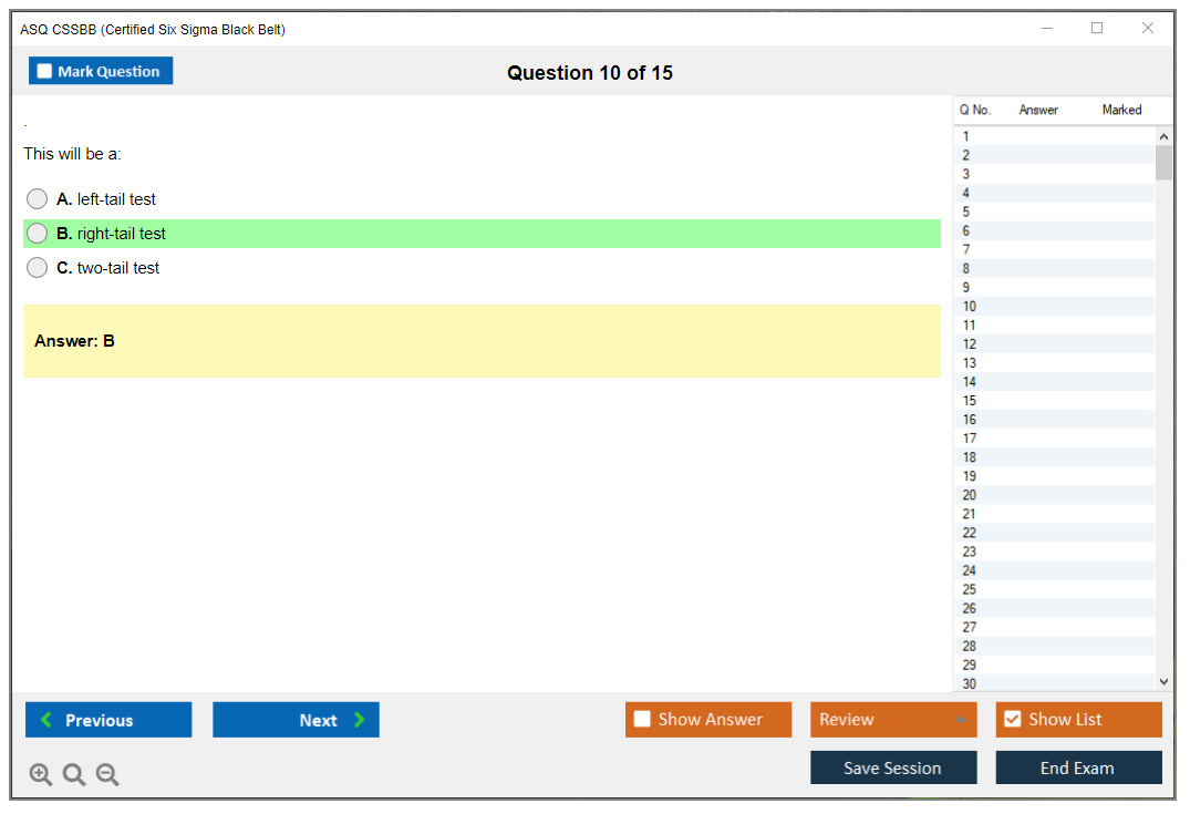 The ASQ CSSBB (Certified Six Sigma Black Belt) exam is a certification exam offered by the American Society for Quality (ASQ) for professionals who seek to demonstrate their expertise in Six Sigma methodologies and tools. The certification is designed for individuals who lead complex improvement projects and have a thorough understanding of Six Sigma principles.