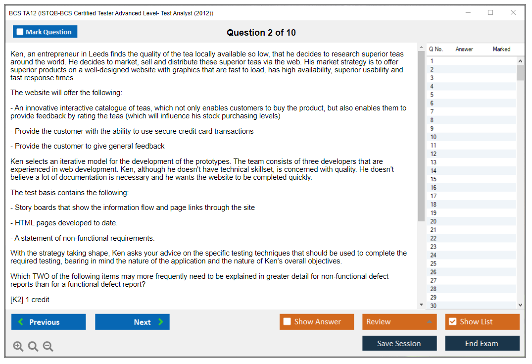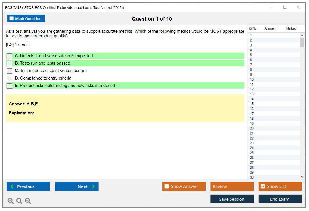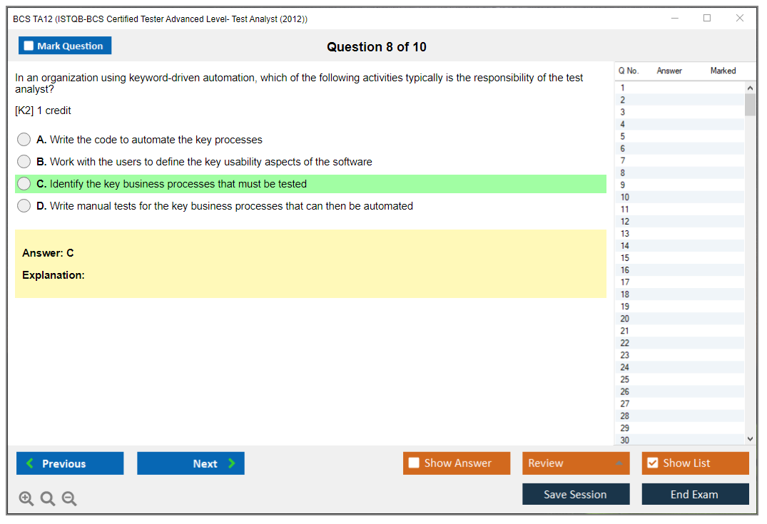 The BCS TA12 (ISTQB-BCS Certified Tester Advanced Level- Test Analyst (2012)) exam is a certification exam designed for individuals who have achieved an advanced point in their careers as software testers. It focuses on advanced testing techniques, test management, and analytical skills required to effectively perform the role of a Test Analyst.