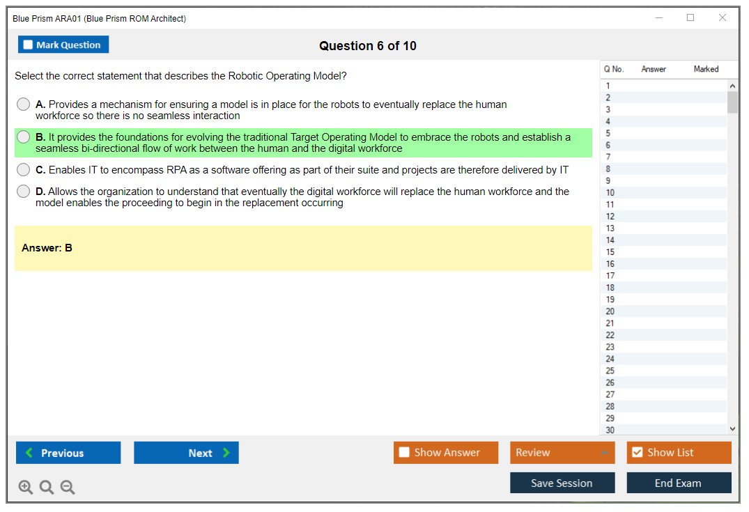 The Blue Prism ARA01 Exam assesses the ability to architect and implement a Blue Prism Robotic Operating Model (ROM), ensuring that candidates possess the necessary knowledge and skills for governance, delivery management, and operational support.