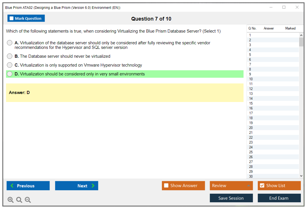 The Blue Prism ATA02 (Designing a Blue Prism (Version 6.0) Environment) Exam is designed to test a candidate's knowledge and skills in designing and configuring a Blue Prism environment. It covers various aspects such as security, scalability, and best practices for setting up a Blue Prism infrastructure.
