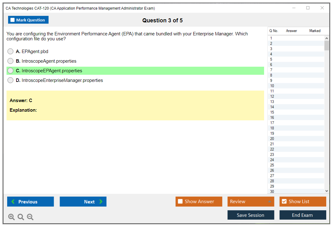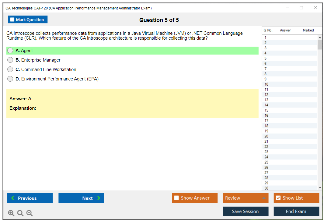 The CA Technologies CAT-120 (CA Application Performance Management Administrator Exam) is a certification exam designed to test the knowledge and skills of candidates in administering CA Application Performance Management (APM) solutions. The exam assesses the ability to configure, manage, and troubleshoot CA APM environments.