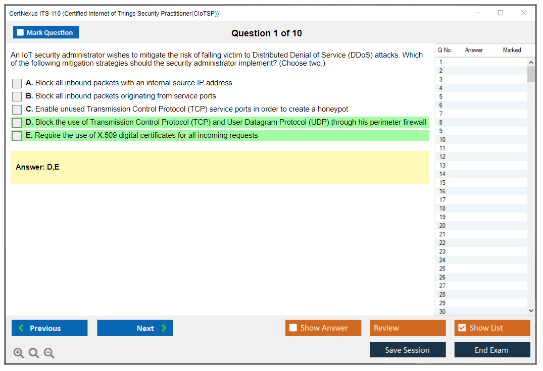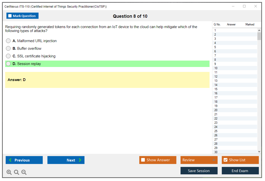The CertNexus ITS-110 (Certified Internet of Things Security Practitioner) Exam is a certification designed to validate the knowledge and skills of professionals in securing IoT (Internet of Things) environments. It covers a wide range of topics including IoT architecture, security methodologies, risk management, and best practices for securing IoT devices and networks.