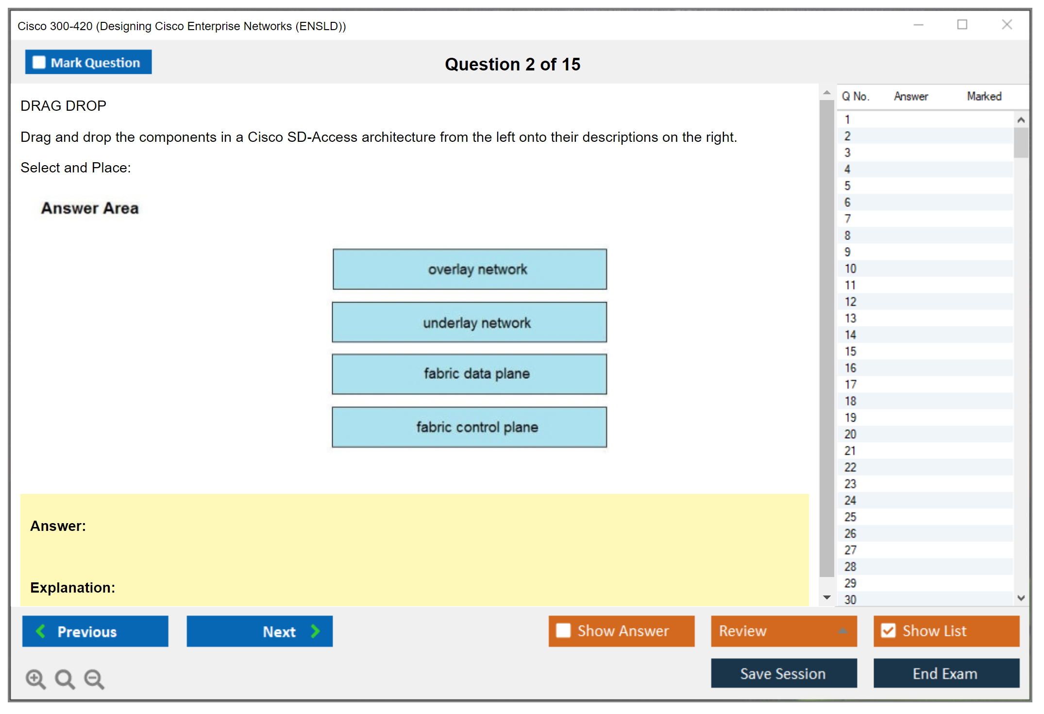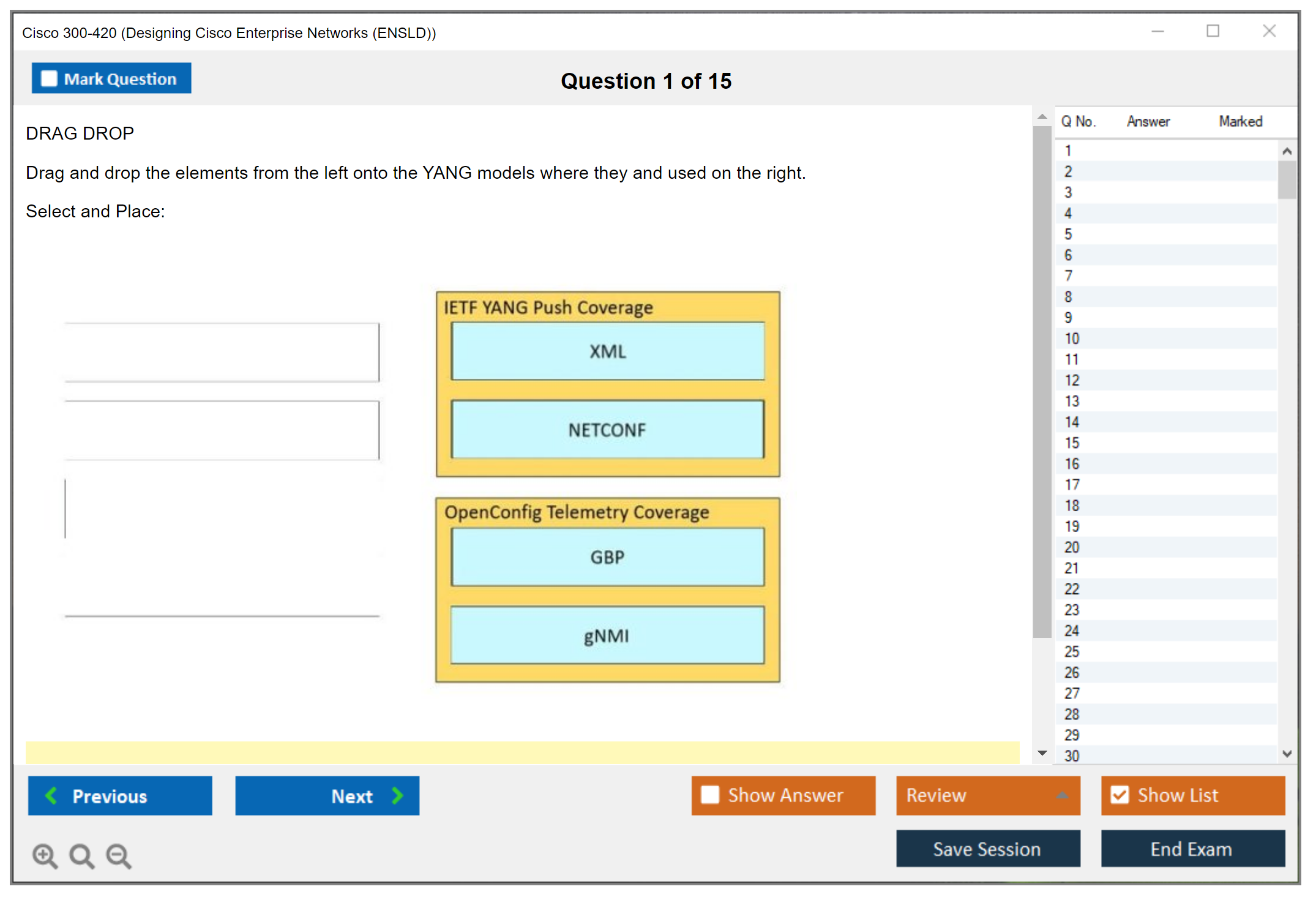 The question format of the Cisco 300-420 exam includes multiple-choice questions, drag-and-drop, and simulation-based questions.