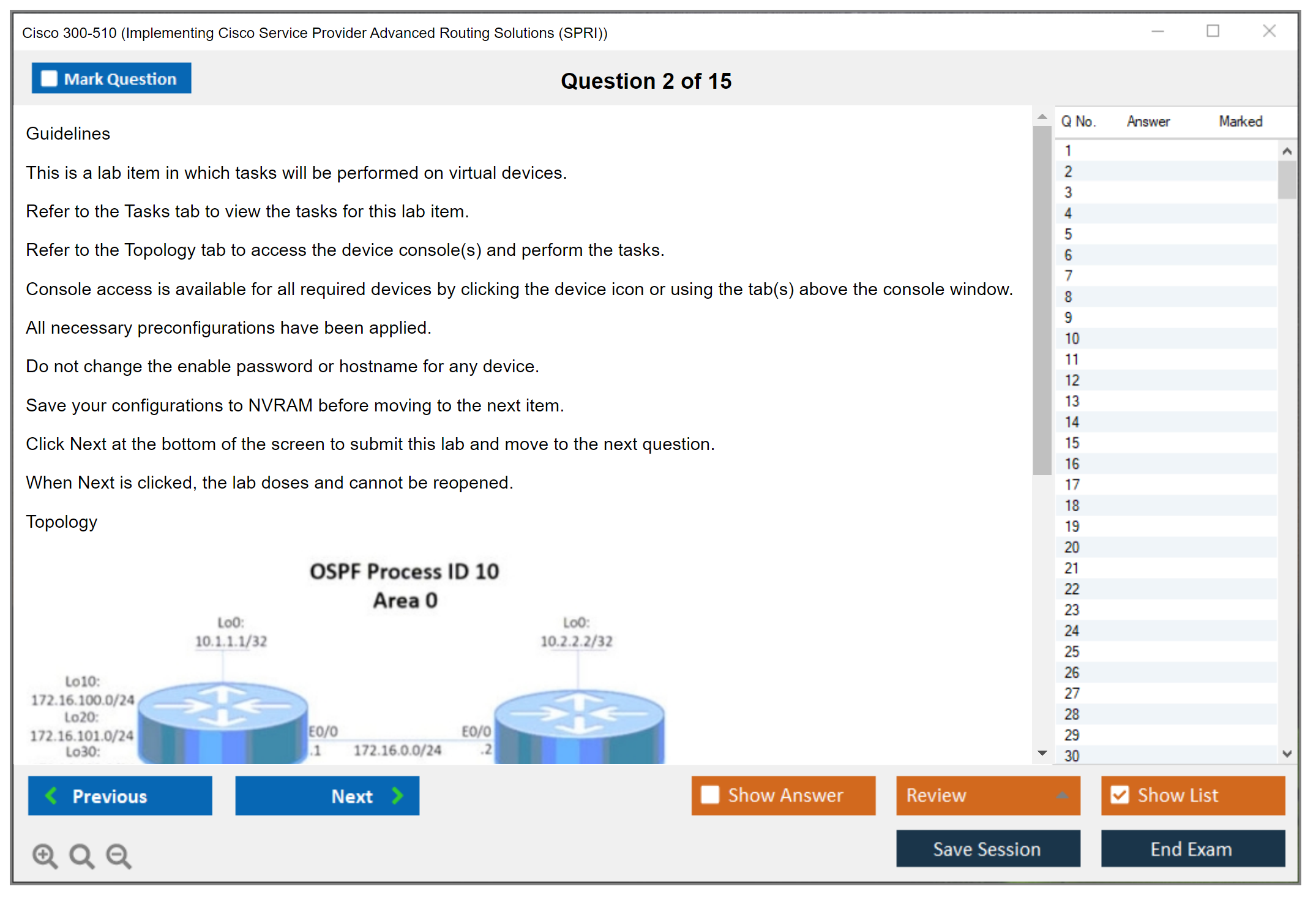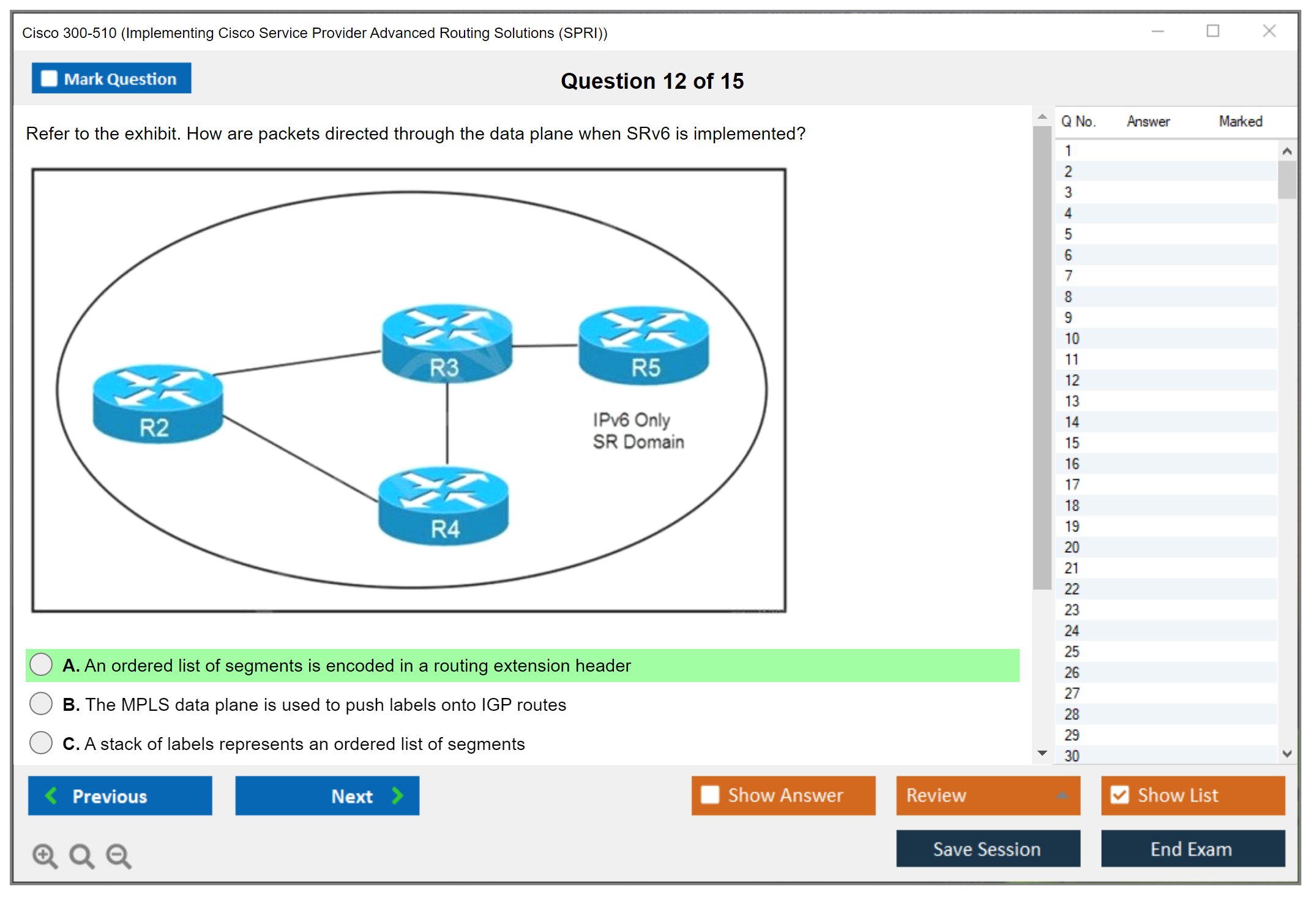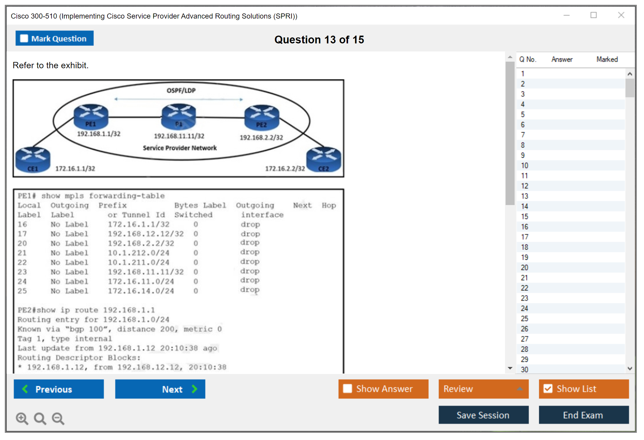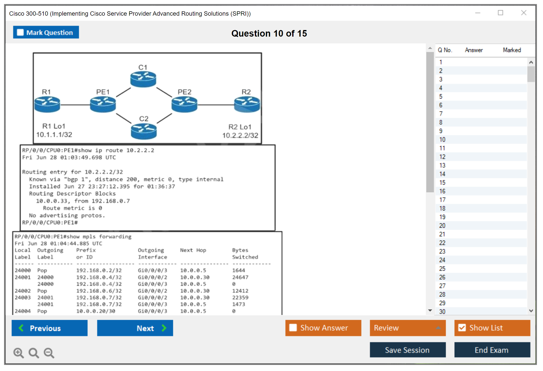The Cisco 300-510 (Implementing Cisco Service Provider Advanced Routing Solutions (SPRI)) exam is a certification exam that tests a candidate's knowledge and skills related to implementing and troubleshooting advanced routing technologies and services in a service provider network.