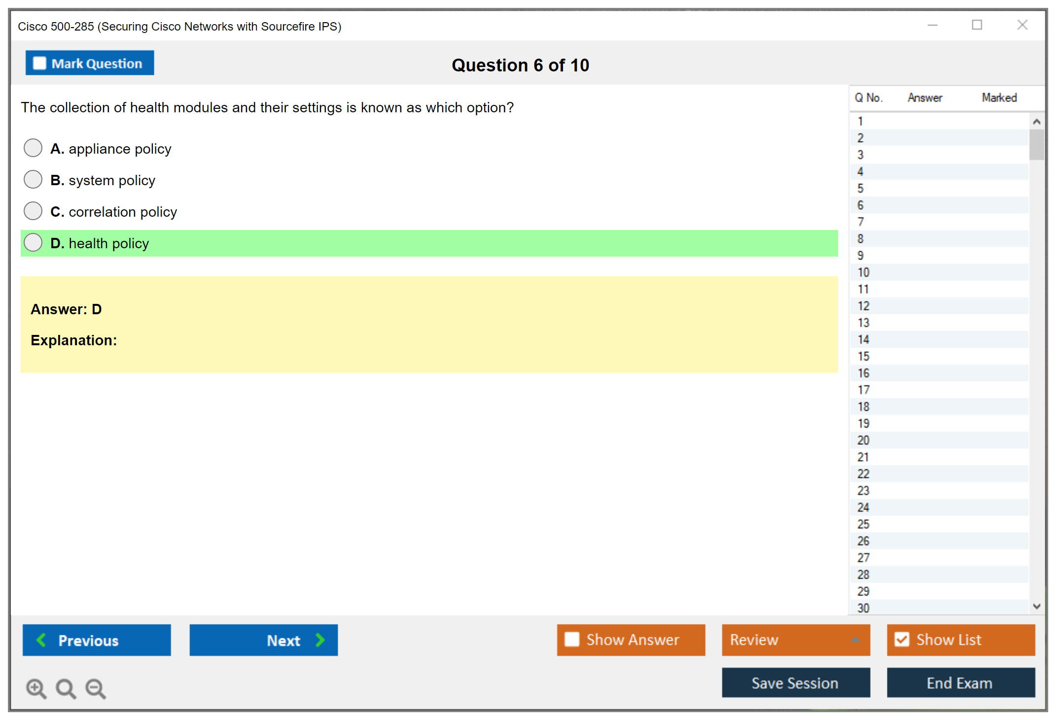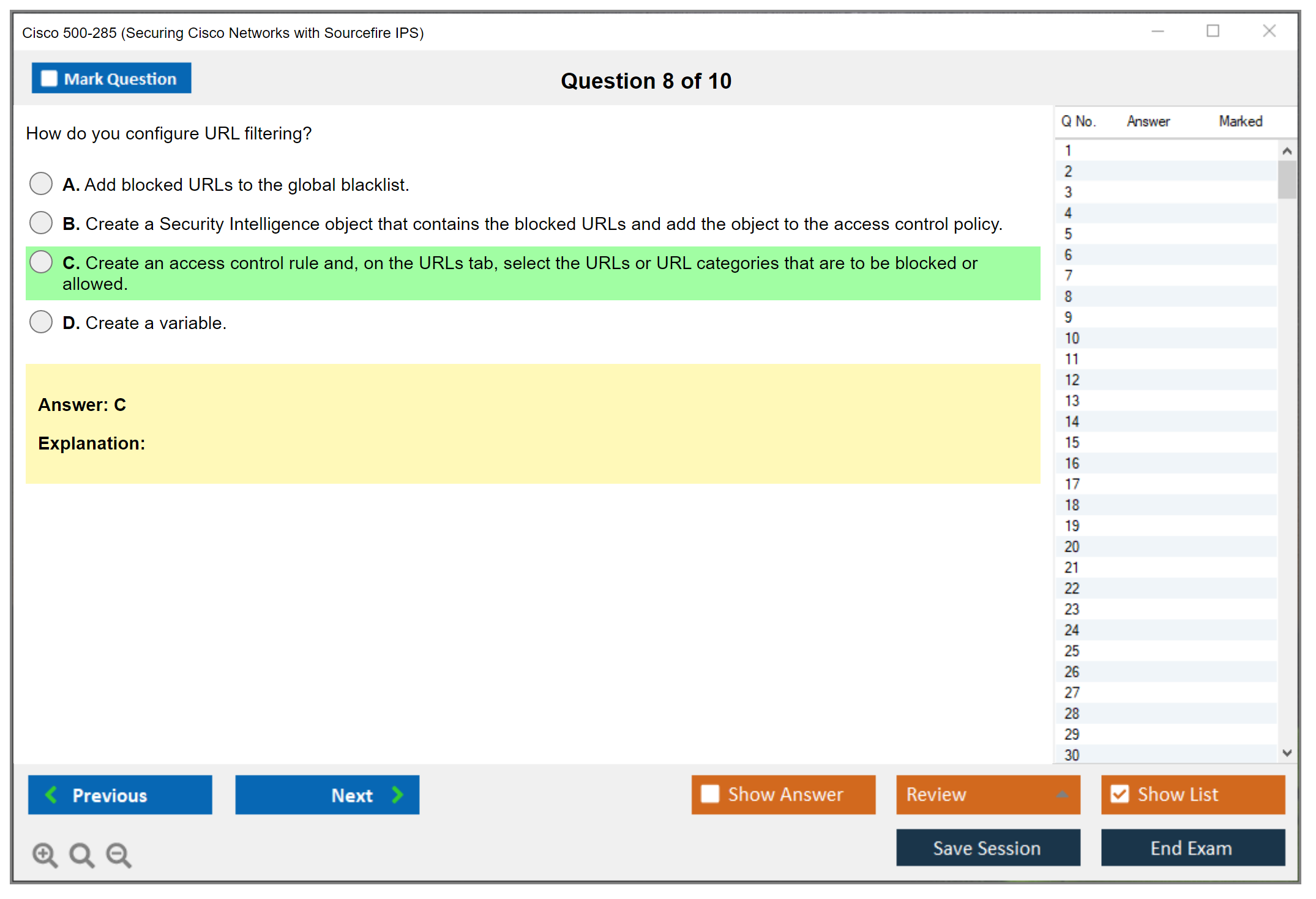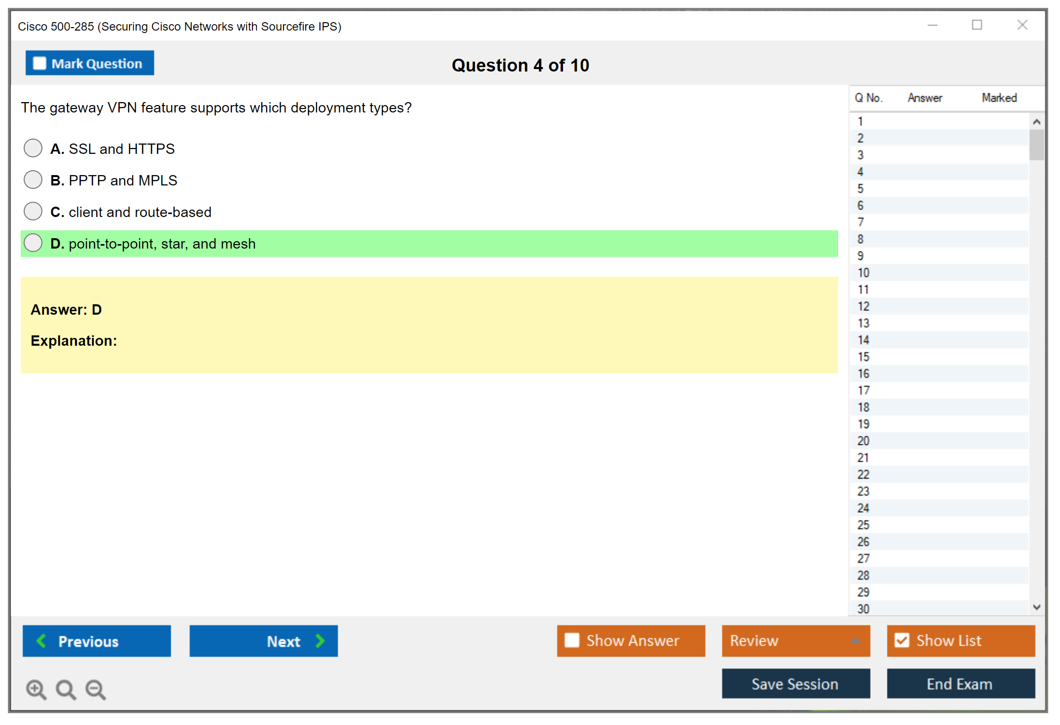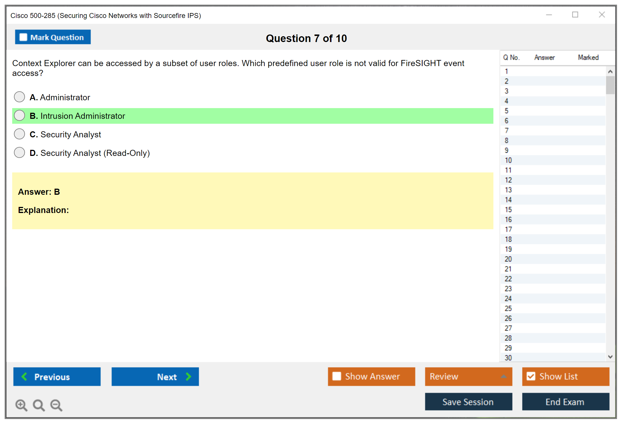 The Cisco 500-285 (Securing Cisco Networks with Sourcefire IPS) exam is designed to test a candidate's knowledge and skills required to implement, configure, and manage the Sourcefire Intrusion Prevention System (IPS). This exam covers various aspects of Sourcefire IPS, including its architecture, deployment, and troubleshooting.