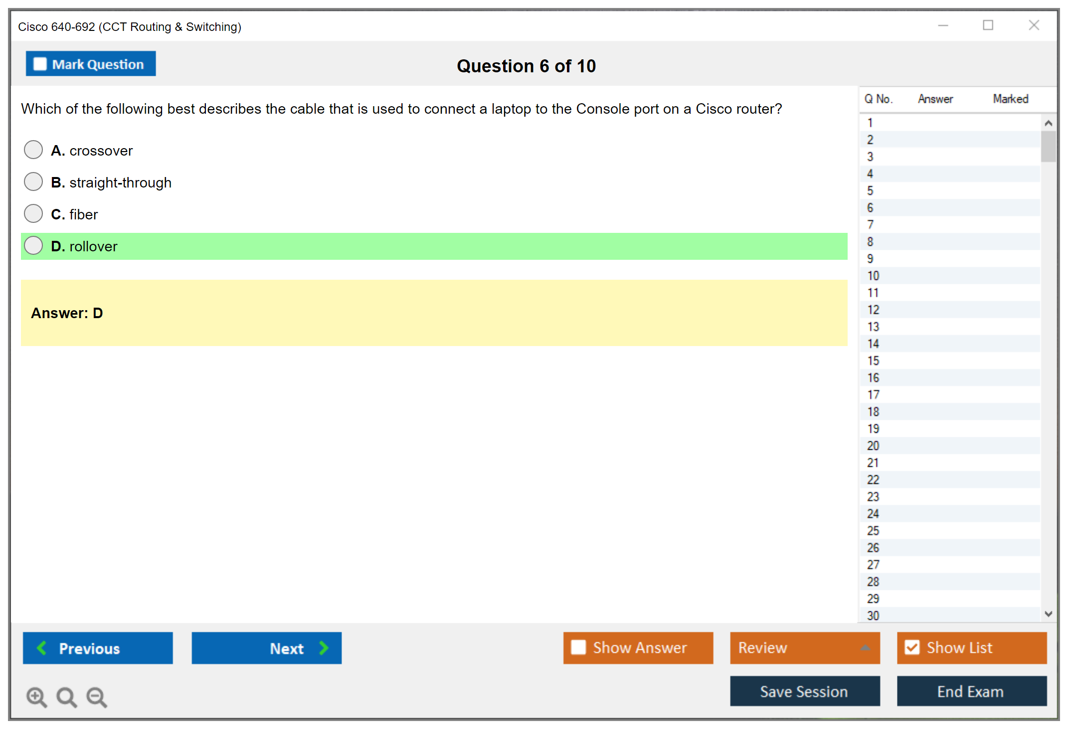 The Cisco 640-692 (CCT Routing & Switching) exam is designed to test a candidate's knowledge and skills related to the support and maintenance of Cisco routers and switches, including the ability to identify Cisco router and switch models, accessories, cabling, and interfaces, as well as common hardware failure issues.