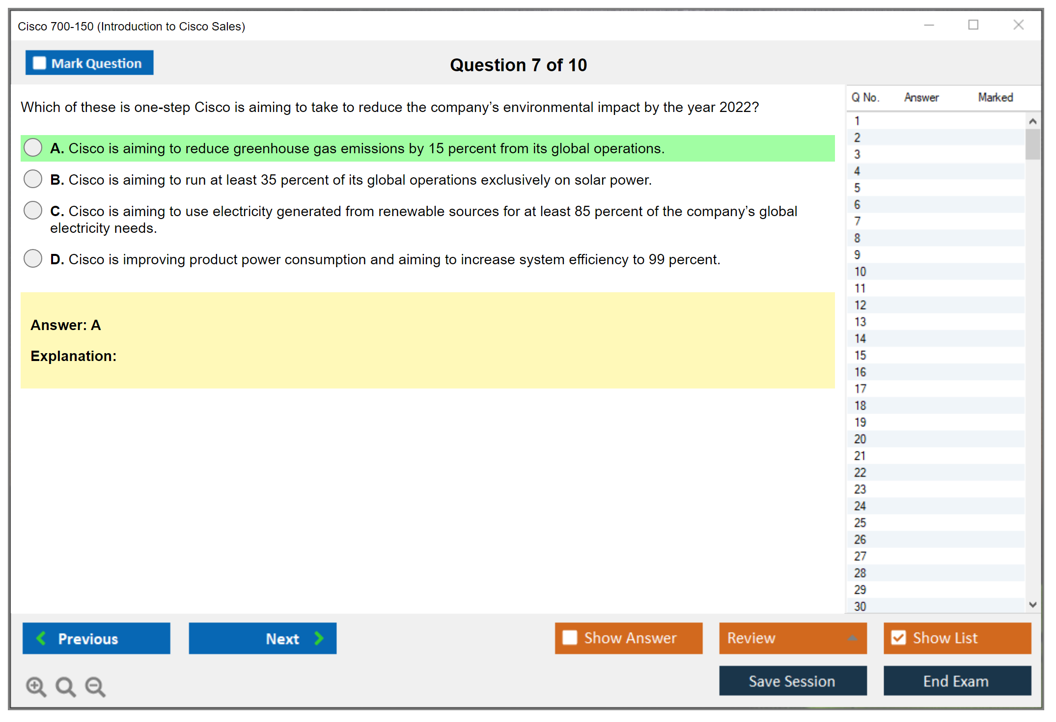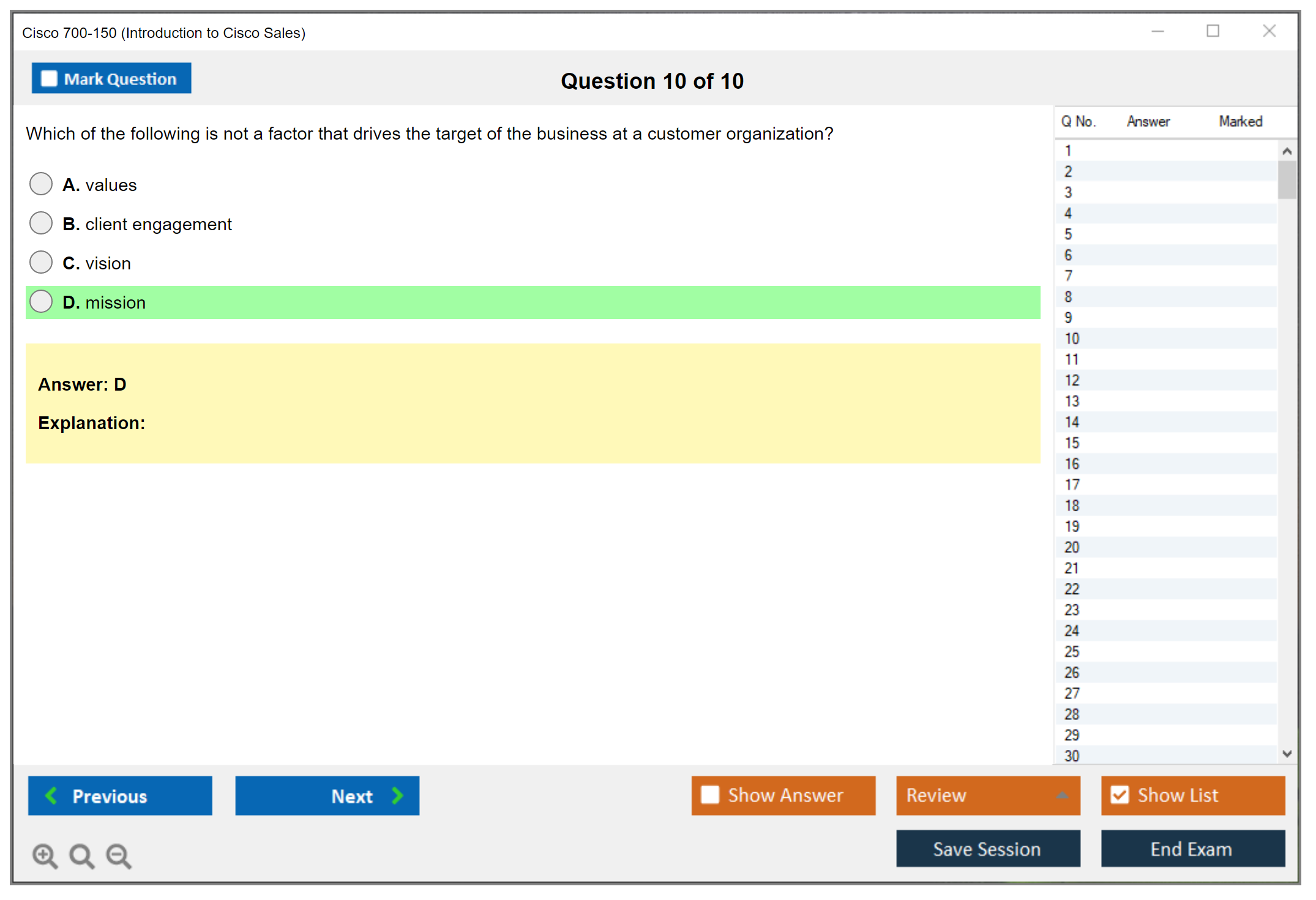 The Cisco 700-150 (Introduction to Cisco Sales) Exam is designed to test the knowledge and skills of sales professionals in understanding and selling Cisco solutions and products. It covers foundational knowledge of Cisco's products, services, and solutions, and their value to customers.