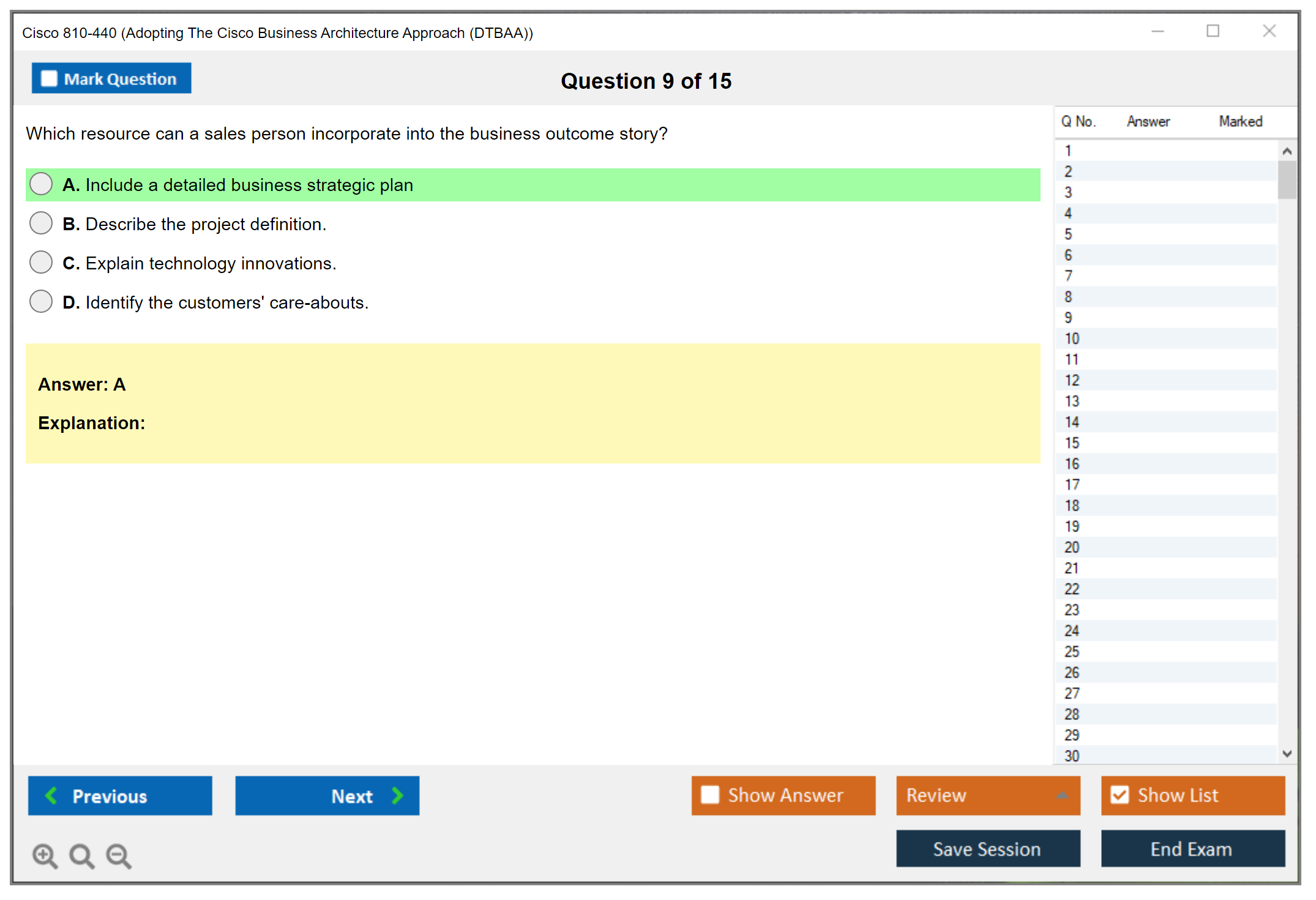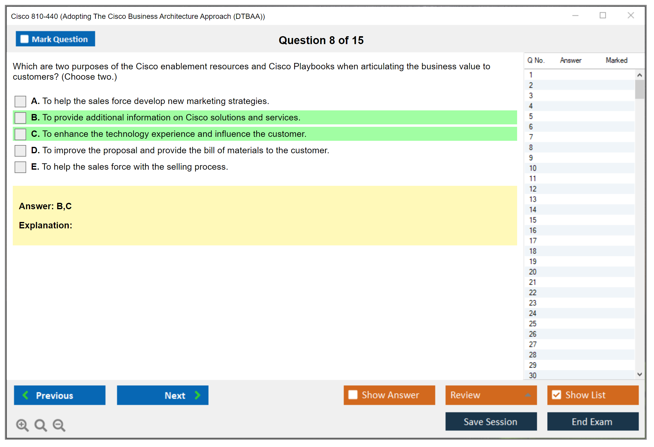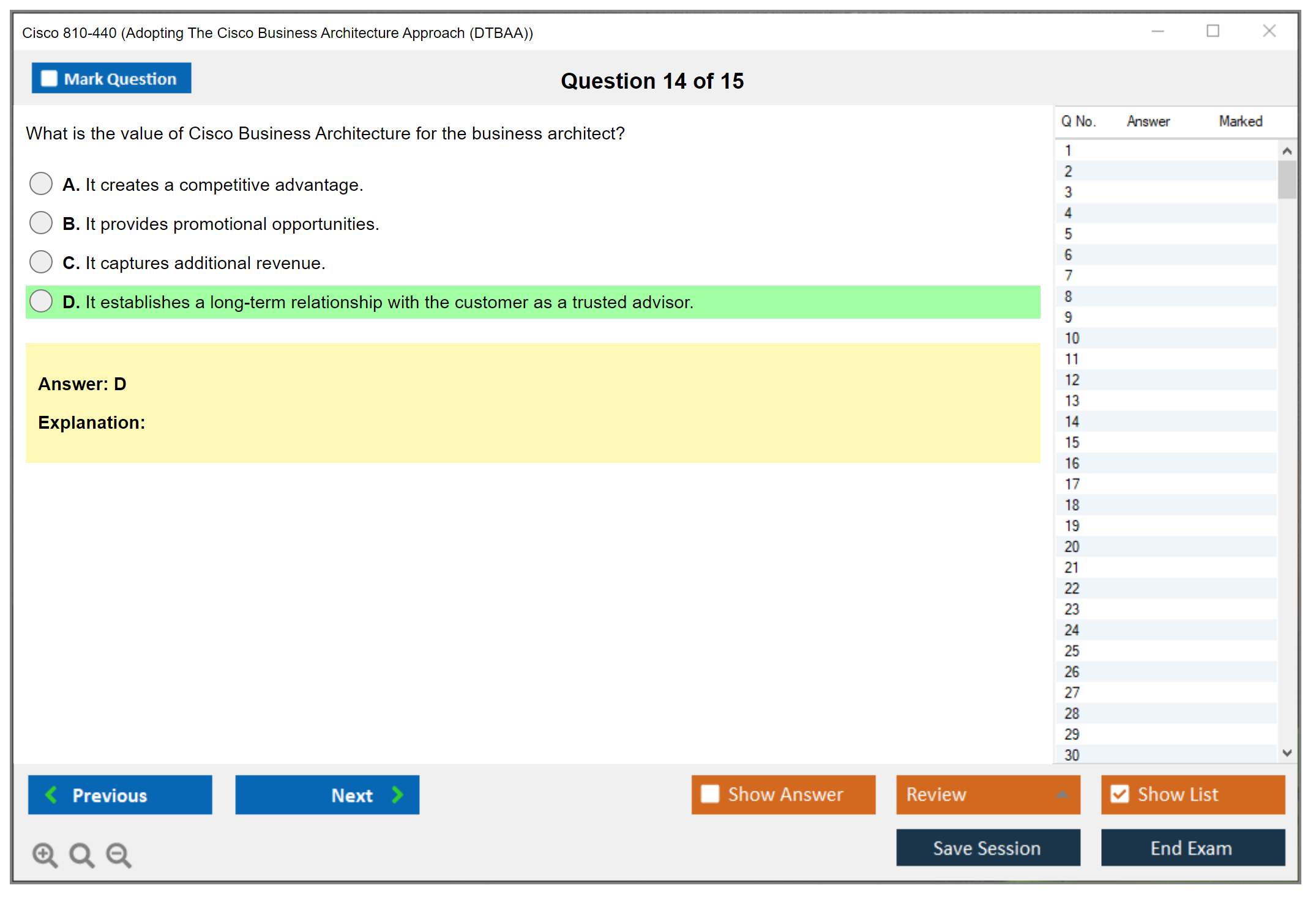 The Cisco 810-440 (Adopting The Cisco Business Architecture Approach (DTBAA)) exam is designed to test a candidate's understanding of the principles and practices involved in adopting a business architecture approach with Cisco solutions. It focuses on the alignment of business and IT strategies, business outcomes, and the development of a business architecture practice.