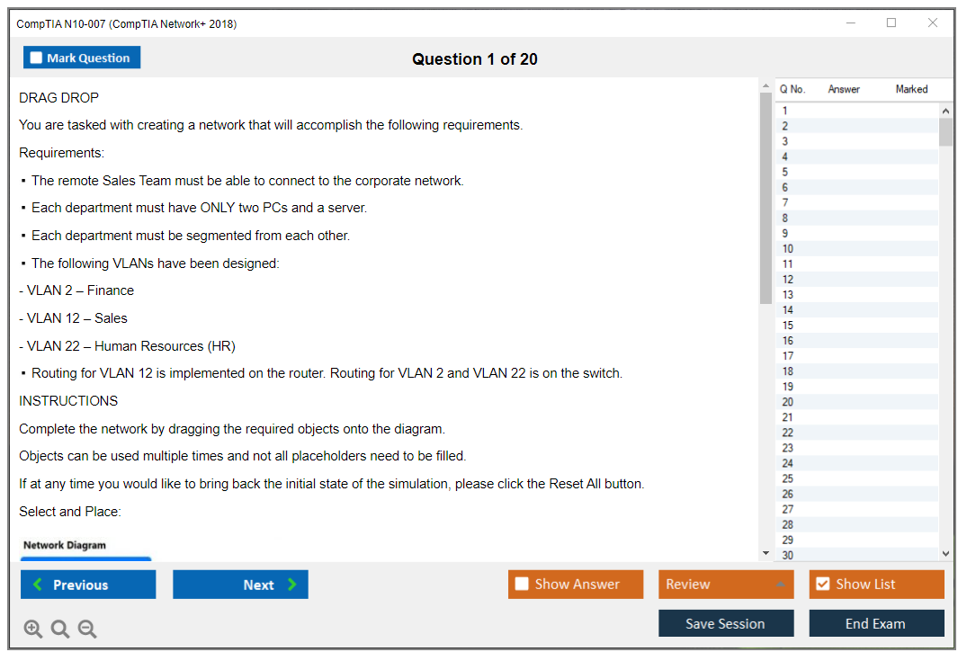 The CompTIA N10-007 exam includes multiple-choice questions (single and multiple response), drag and drops, and performance-based questions.