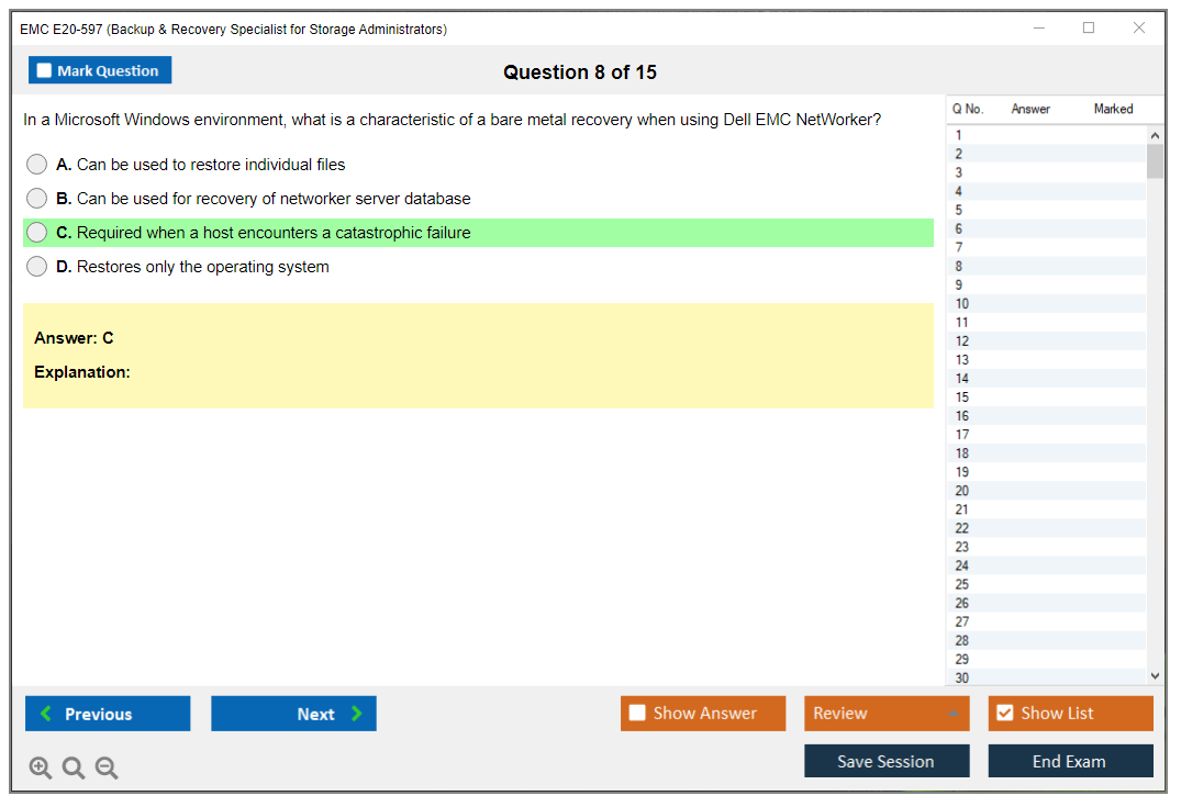 The EMC E20-597 (Backup & Recovery Specialist for Storage Administrators) Exam is designed to validate the knowledge and skills required to deploy, configure, and manage EMC backup and recovery solutions. This certification focuses on various EMC technologies and products, ensuring that professionals can effectively handle backup and recovery tasks in enterprise environments.