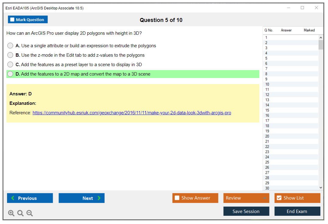 The Esri EADA105 (ArcGIS Desktop Associate 10.5) Exam is designed to test the knowledge and skills of individuals in using ArcGIS Desktop 10.5 software. It covers various aspects of GIS (Geographic Information Systems) including data management, analysis, and visualization.