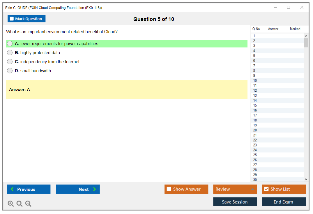 The EXIN Cloud Computing Foundation (CLOUDF) exam provides a comprehensive introduction to cloud computing. It is aimed at individuals who want to validate their understanding of the fundamental concepts and principles of cloud computing.