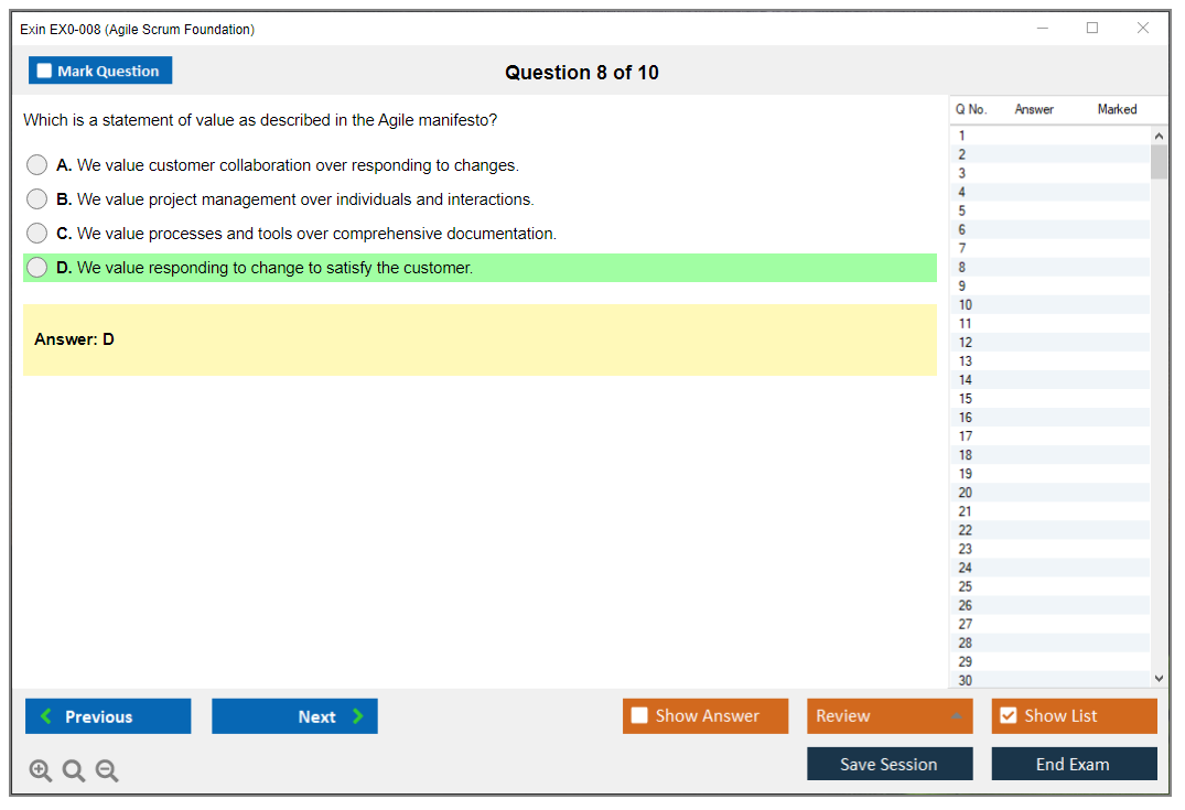 The Exin EX0-008 (Agile Scrum Foundation) Exam is designed to validate a candidate's knowledge of Agile methodologies and Scrum practices. It covers key concepts such as Agile principles, Scrum practices, roles, events, and artifacts.