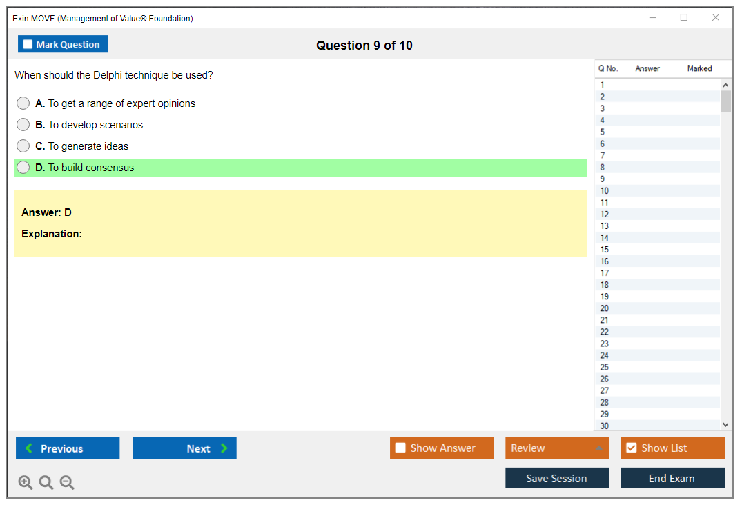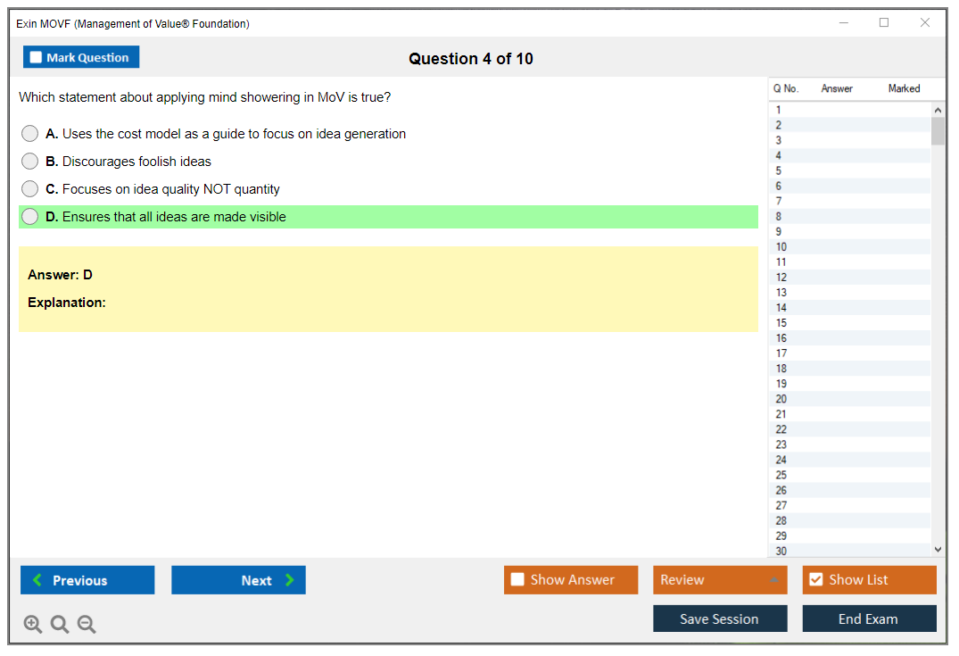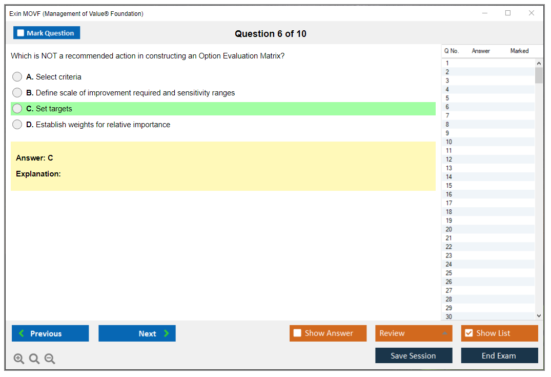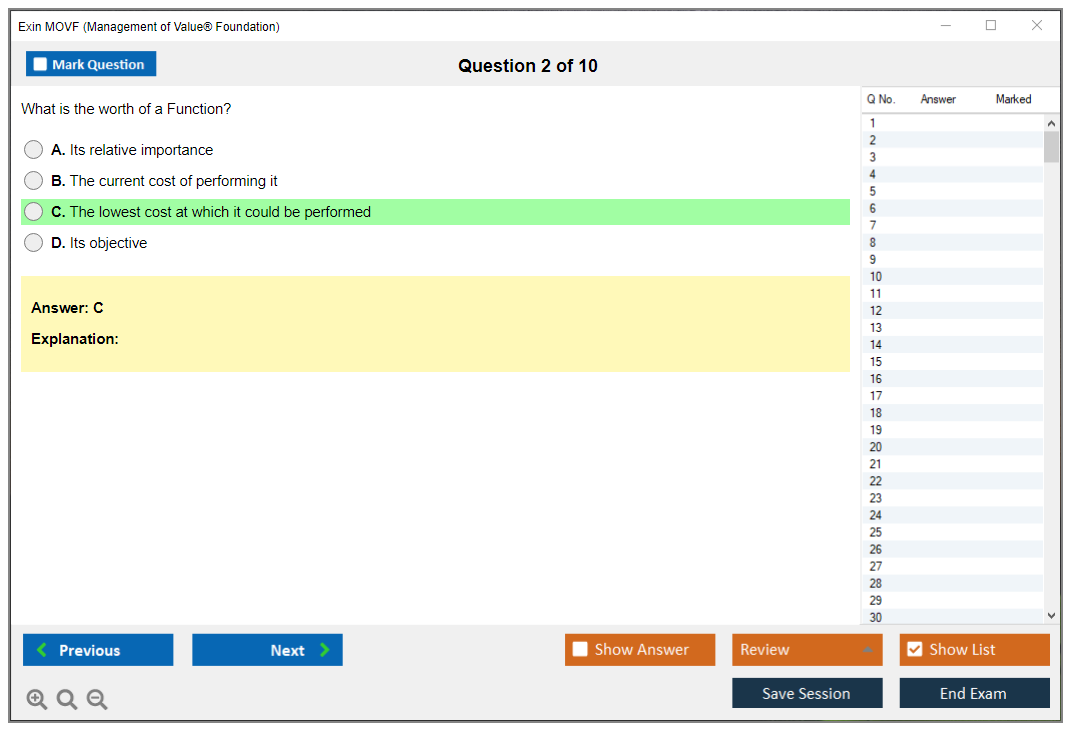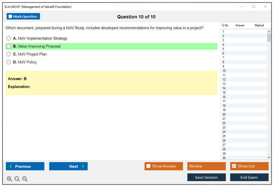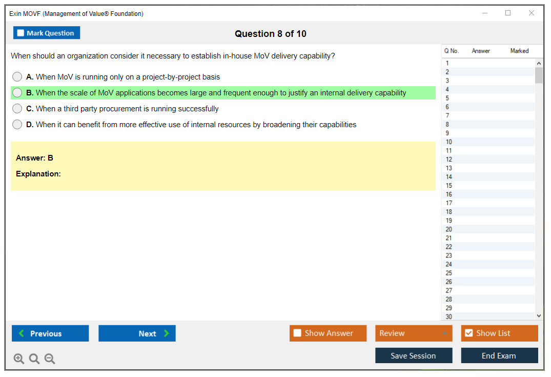 The Exin MOVF (Management of Value® Foundation) Exam is designed to provide individuals with the knowledge and skills to maximize value within an organization by implementing value management principles. It focuses on the concepts and methodologies used to enhance value in projects, portfolios, and programs.