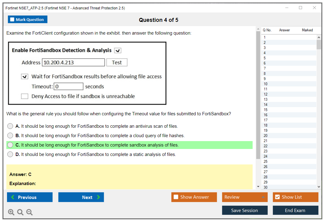 The Fortinet NSE7_ATP-2.5 exam is part of the Fortinet Network Security Expert (NSE) certification program, which includes multiple levels of certification from NSE 1 to NSE 8.