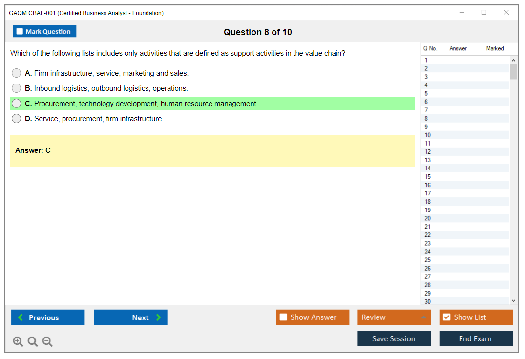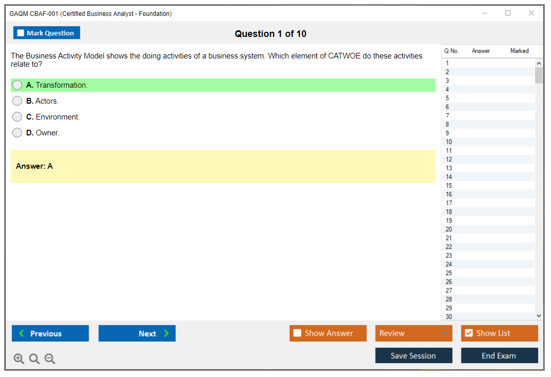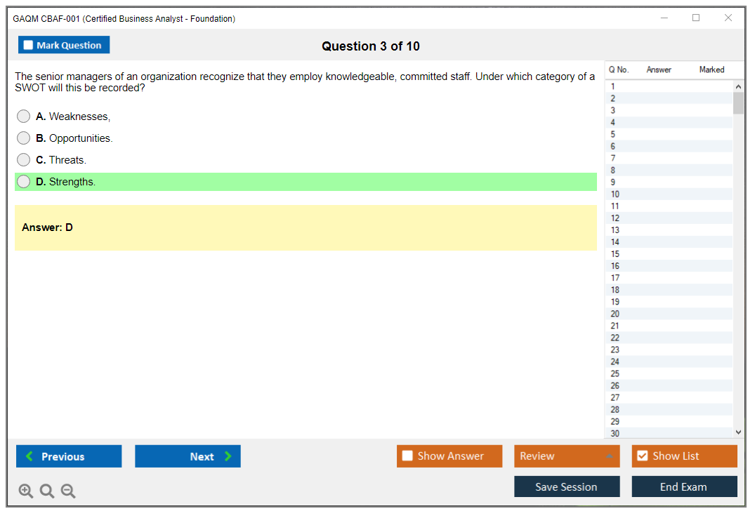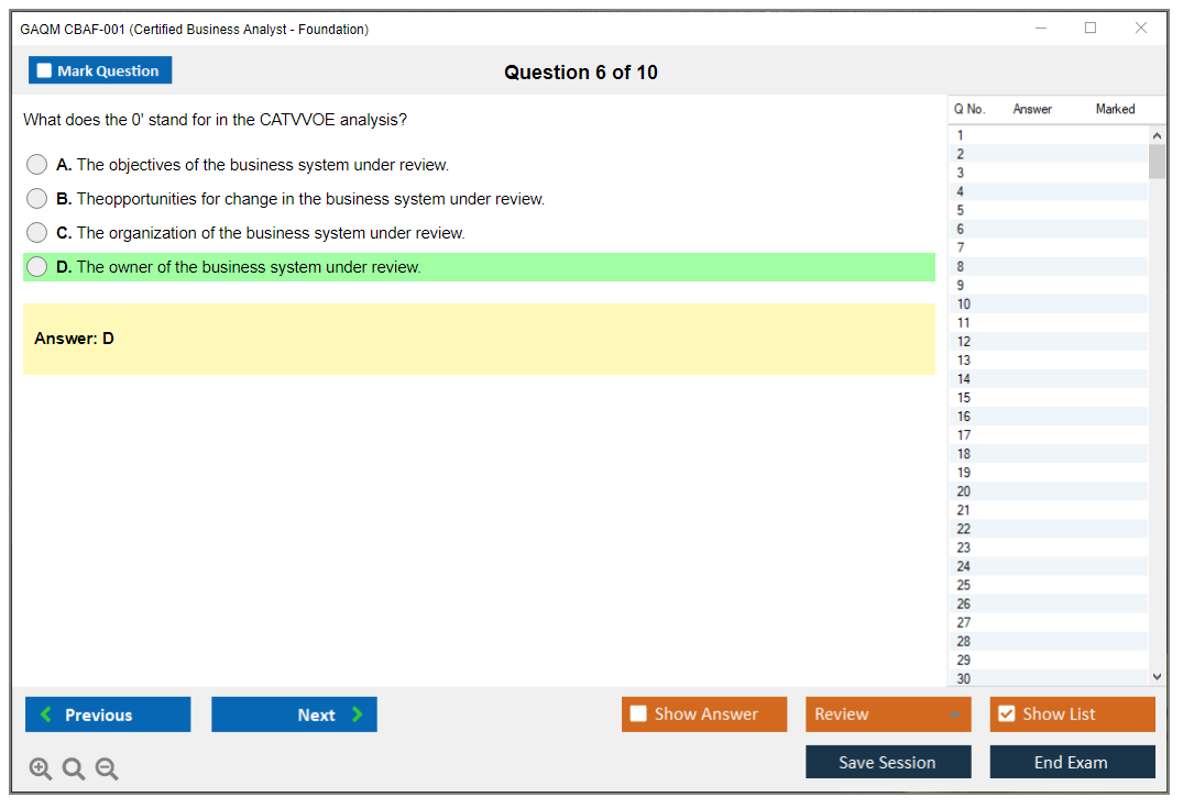 The GAQM CBAF-001 (Certified Business Analyst - Foundation) exam is designed to validate the fundamental skills and knowledge of business analysis. It covers various aspects of business analysis, including requirements gathering, analysis, and documentation.