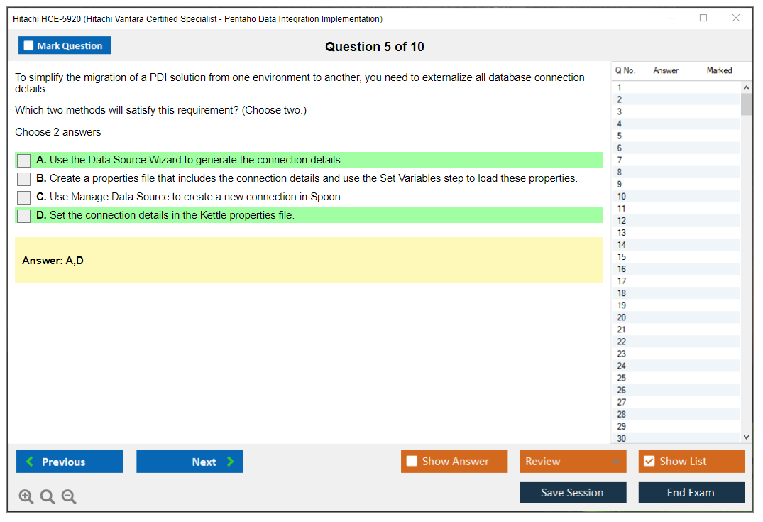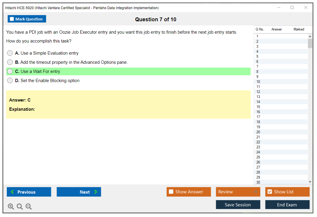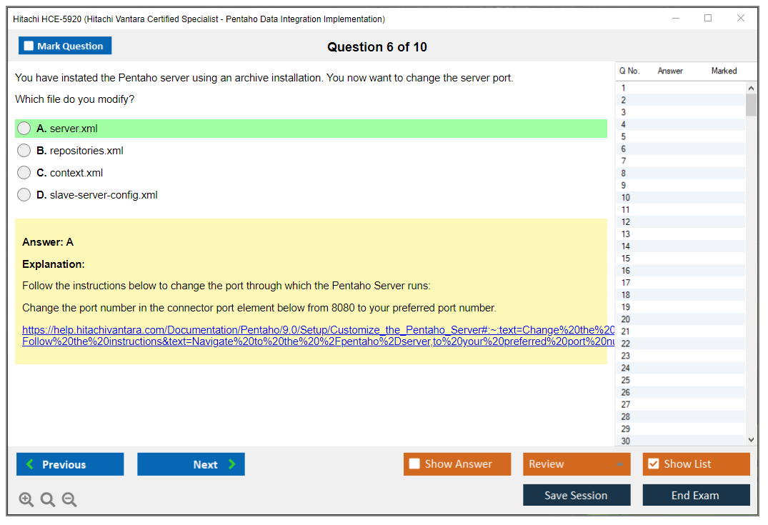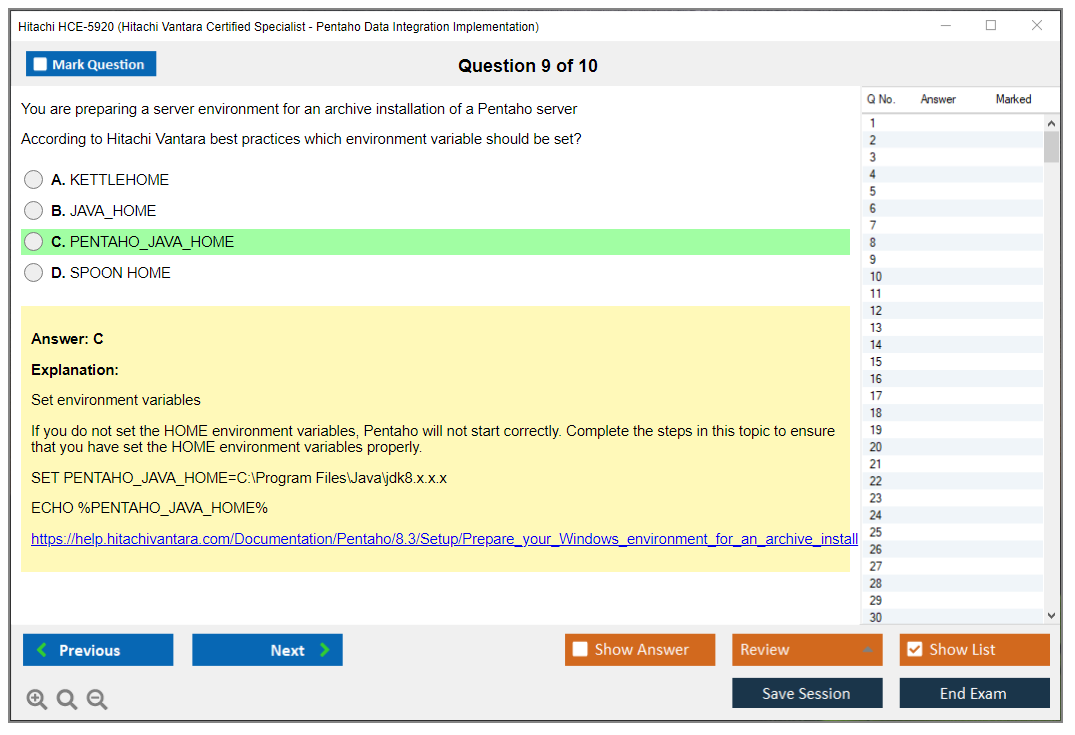 The Hitachi HCE-5920 exam, also known as the Hitachi Vantara Certified Specialist - Pentaho Data Integration Implementation, assesses a candidate's proficiency in using Pentaho Data Integration tools and solutions. It is intended for professionals who implement and maintain PDI environments.