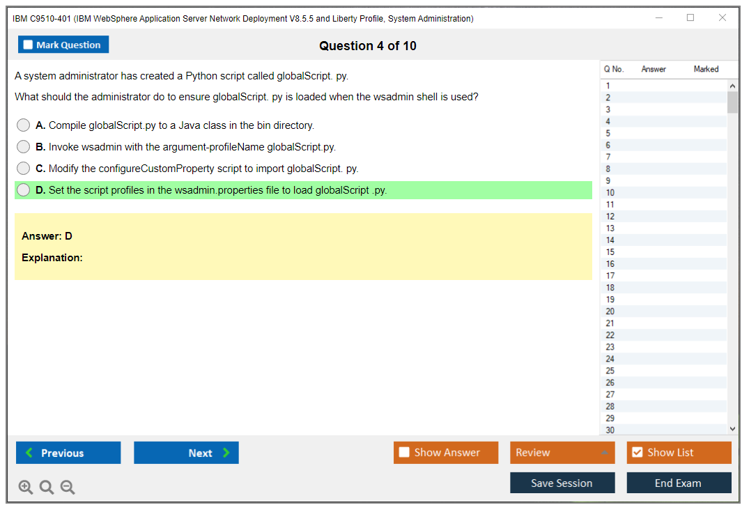 The IBM C9510-401 exam, also known as the IBM WebSphere Application Server Network Deployment V8.5.5 and Liberty Profile System Administration exam, assesses a candidate's skills in managing and configuring IBM WebSphere Application Server environments. This includes knowledge of installation, configuration, and maintenance of the server, as well as troubleshooting and performance tuning.