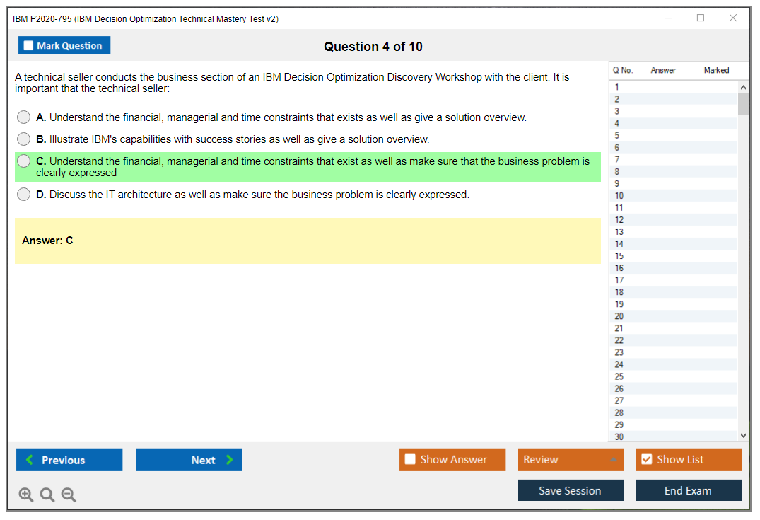 The IBM P2020-795 (IBM Decision Optimization Technical Mastery Test v2) Exam is designed to test the technical knowledge and skills required to implement and manage IBM Decision Optimization solutions.