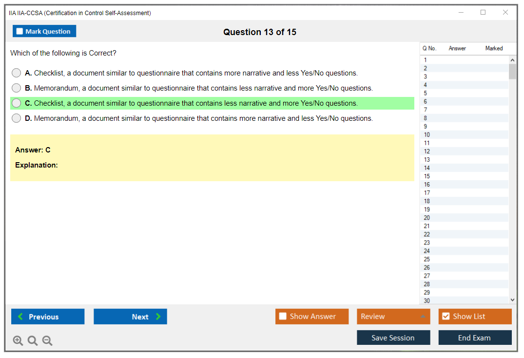 The IIA IIA-CCSA (Certification in Control Self-Assessment® (CCSA®)) exam is designed to test the knowledge and skills of professionals in the field of control self-assessment. It validates the ability to identify risks, assess control processes, and recommend improvements.