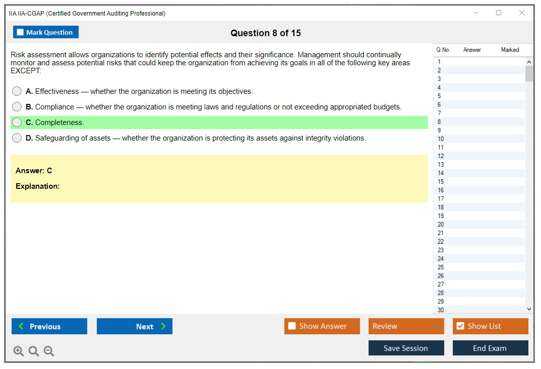 The IIA IIA-CGAP Exam is a specialized certification exam designed to assess the knowledge and skills of auditors working in the public sector. It covers various aspects of government auditing, including standards, principles, and practices.