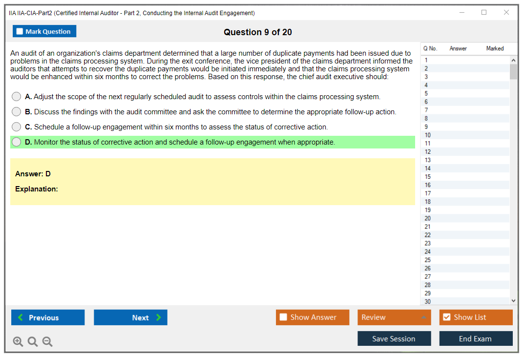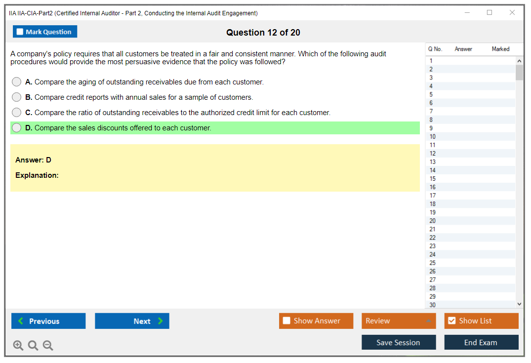 The IIA IIA-CIA-Part2 exam, also known as the Practice of Internal Auditing, is the second part of the Certified Internal Auditor (CIA) certification. It assesses a candidate's ability to apply internal audit concepts and techniques to real-world situations.