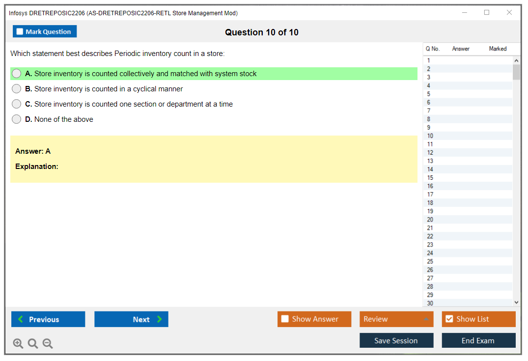 The Infosys DRETREPOSIC2206 (AS-DRETREPOSIC2206-RETL Store Management Mod) Exam is designed to evaluate the knowledge and skills of professionals in store management within retail environments. It covers various aspects of store operations, inventory management, customer service, and retail technologies.