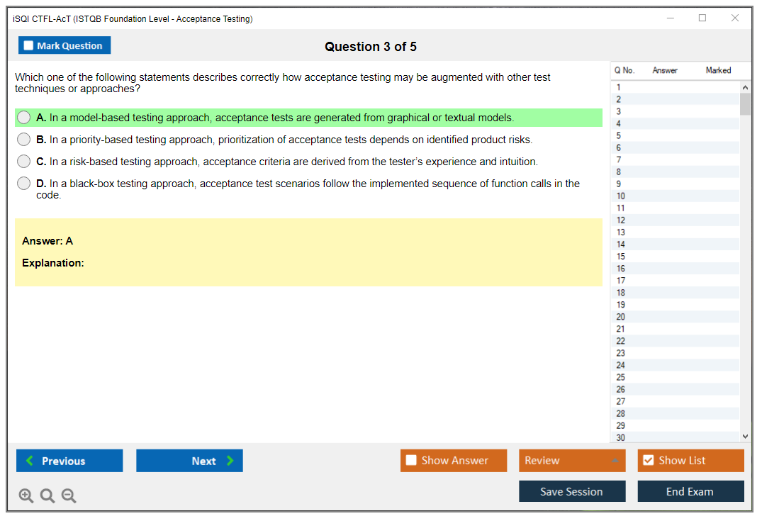 The iSQI CTFL-AcT (ISTQB Foundation Level - Acceptance Testing) exam is designed to certify individuals in the principles and practices of acceptance testing. This certification is part of the ISTQB Certified Tester scheme and focuses on the knowledge required to perform acceptance testing effectively.