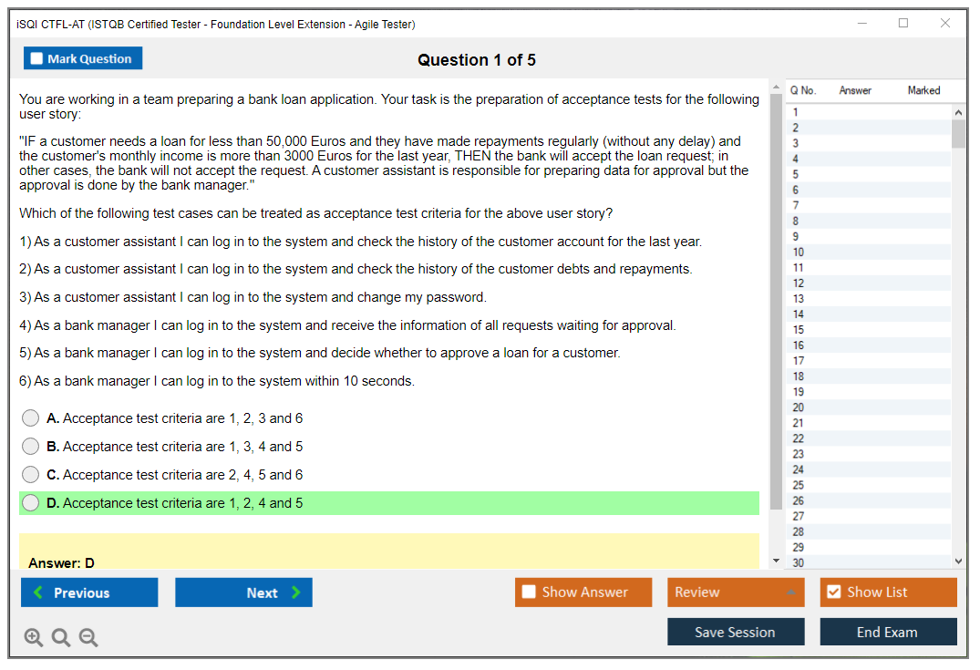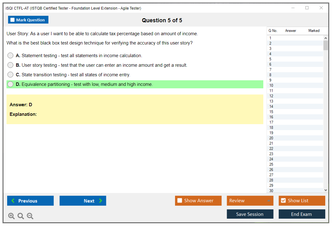 The iSQI CTFL-AT Exam consists of 40 multiple-choice questions.