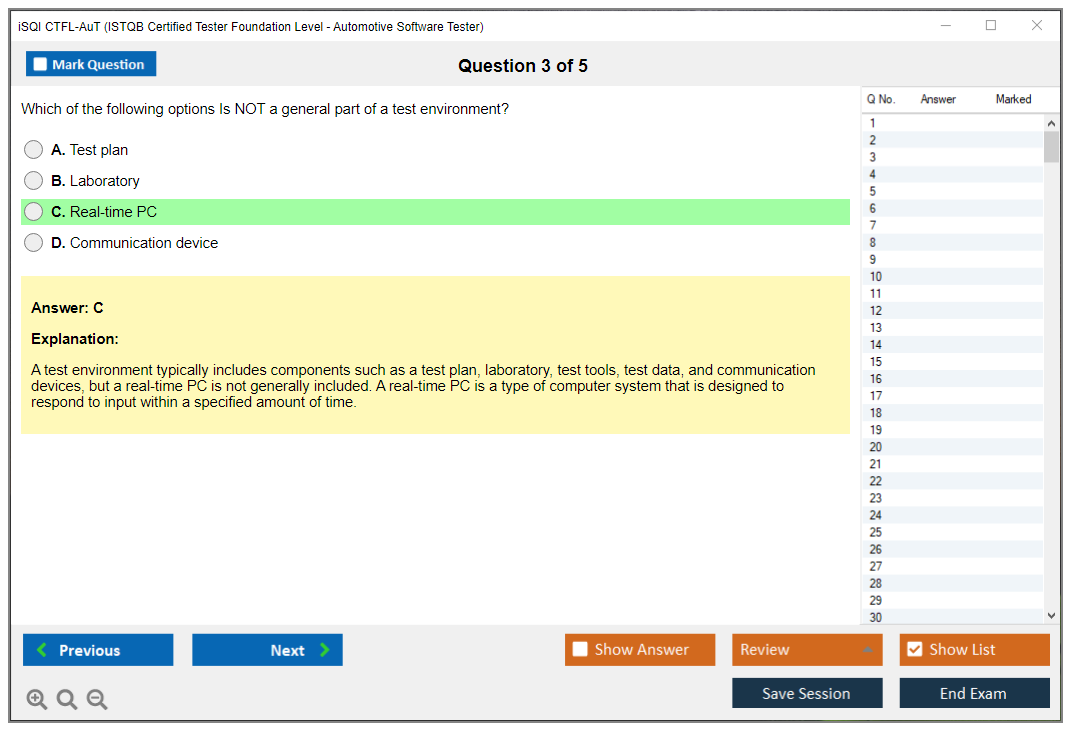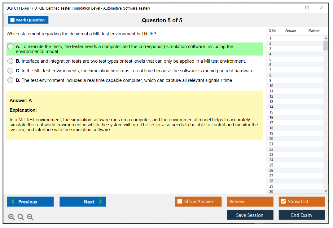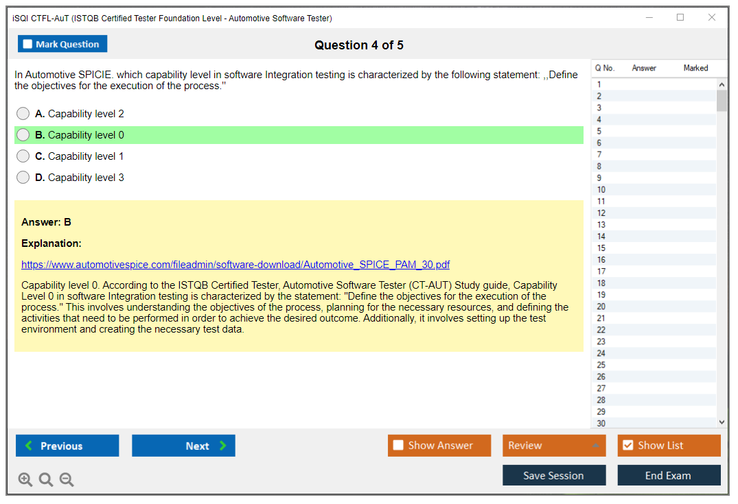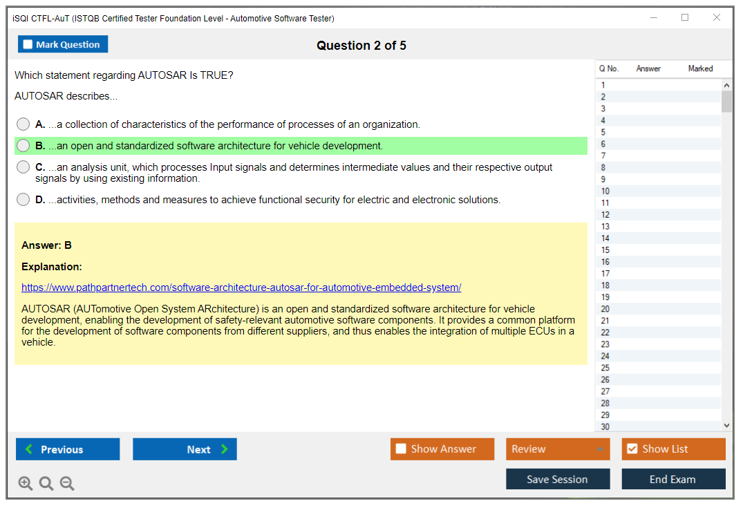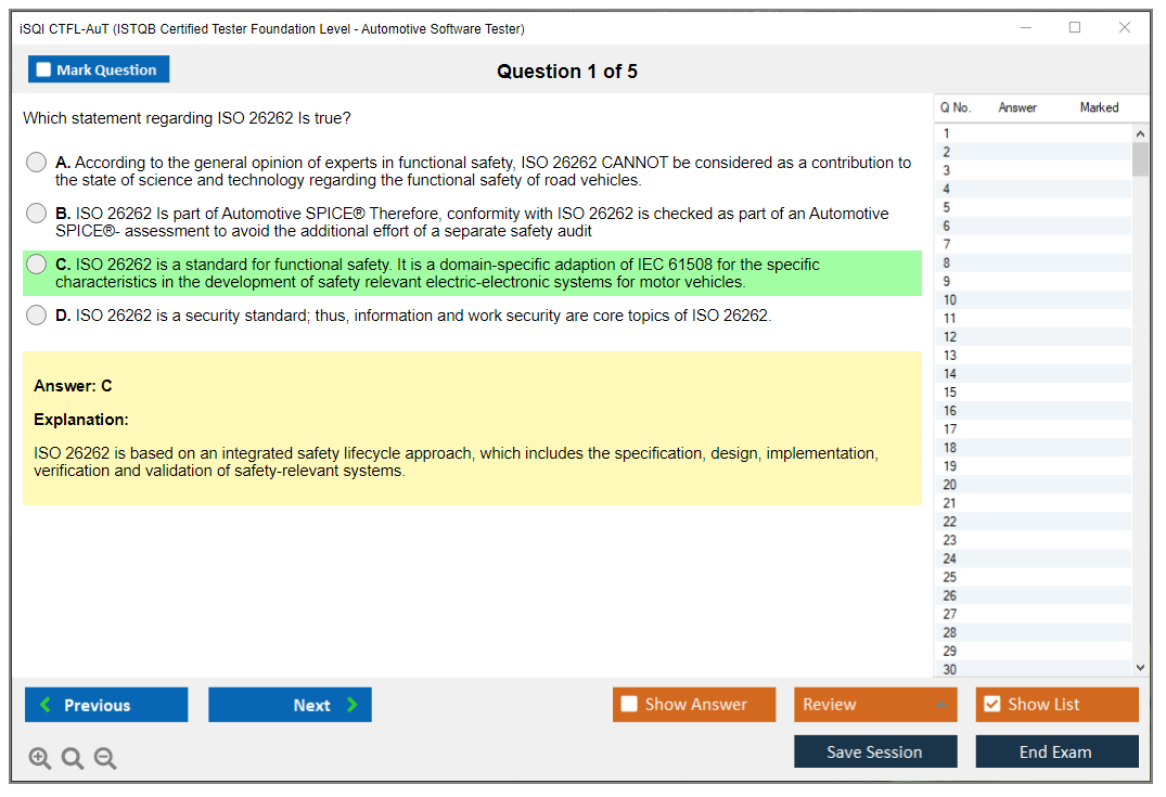 The iSQI CTFL-AuT (ISTQB Certified Tester Foundation Level - Automotive Software Tester) exam is a certification designed for professionals involved in automotive software testing. It focuses on the specific requirements, techniques, and standards used in the automotive industry.