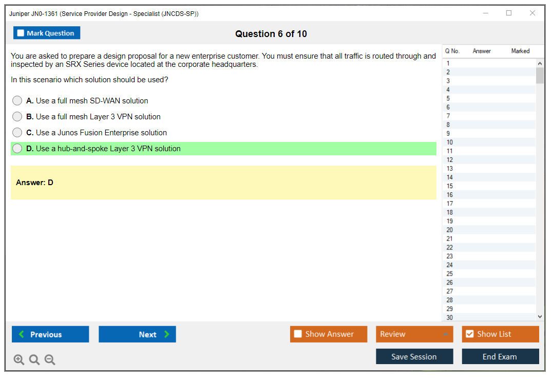 The Juniper JN0-1361 exam is part of the Juniper Networks Certified Design Specialist (JNCDS-SP) certification track. It focuses on validating the skills required to design service provider networks, including WAN, data center, and security solutions.