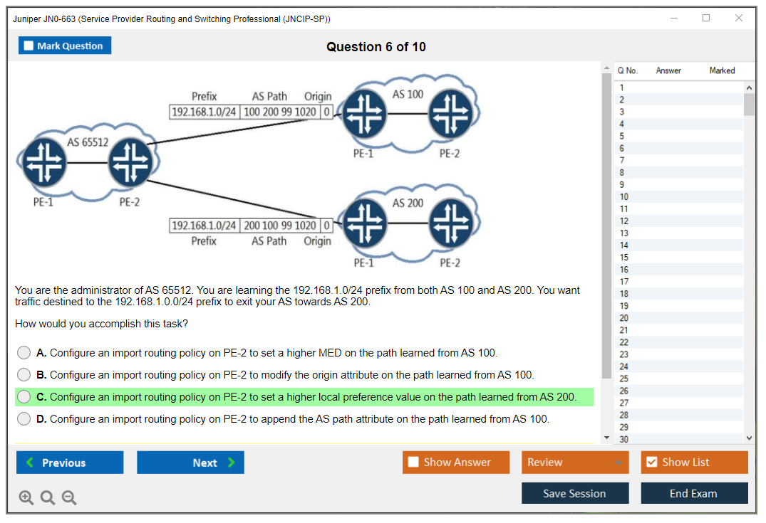 The Juniper JN0-663 exam is a professional-level certification exam that tests the candidate's expertise in advanced routing technologies and related platform configuration and troubleshooting skills. It is part of the Juniper Networks Certification Program (JNCP) and focuses on the Junos OS used in service provider environments.