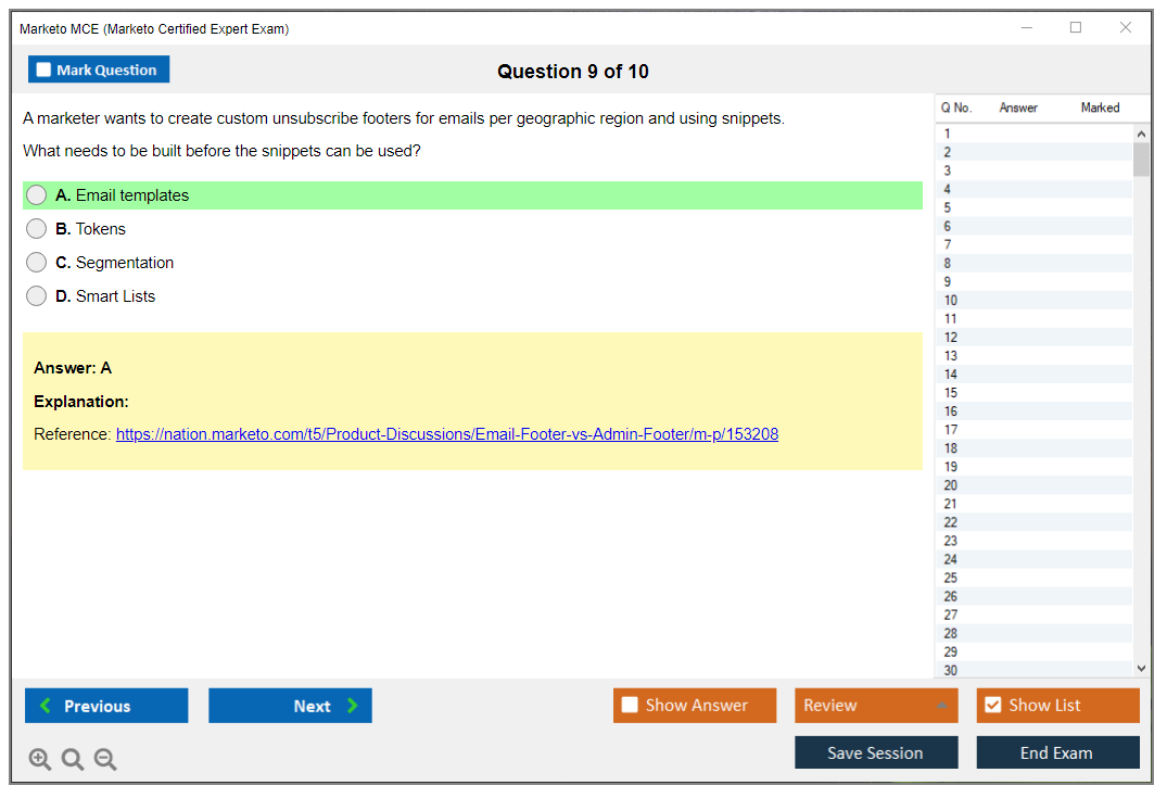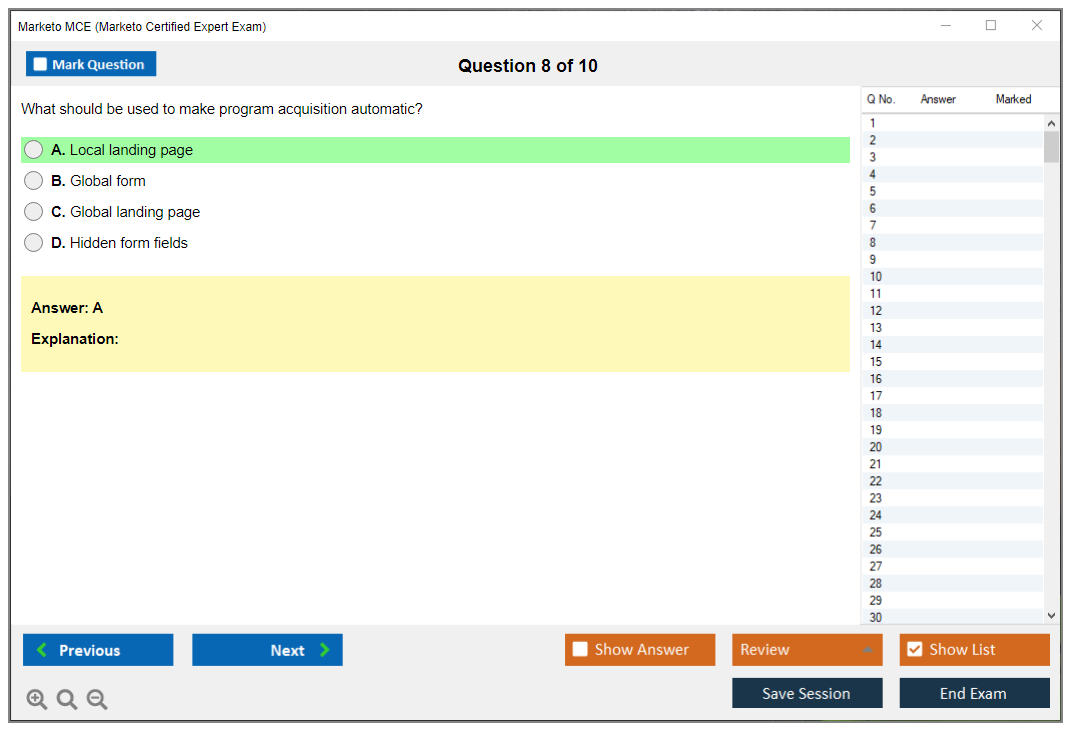 The Marketo Certified Expert (MCE) Exam is a certification exam designed to validate the expertise of professionals who use Marketo, a leading marketing automation platform. The exam tests the candidate's knowledge and skills in using Marketo to manage marketing campaigns, lead management, and other key functionalities.