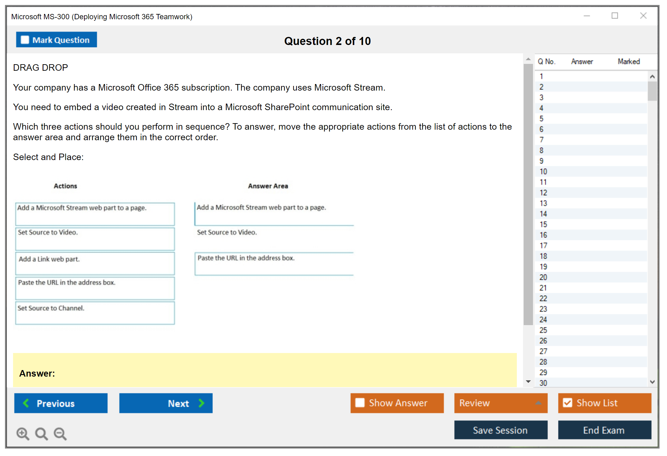 The question format of the Microsoft MS-300 Exam includes multiple-choice questions, case studies, drag and drop, and build list questions.