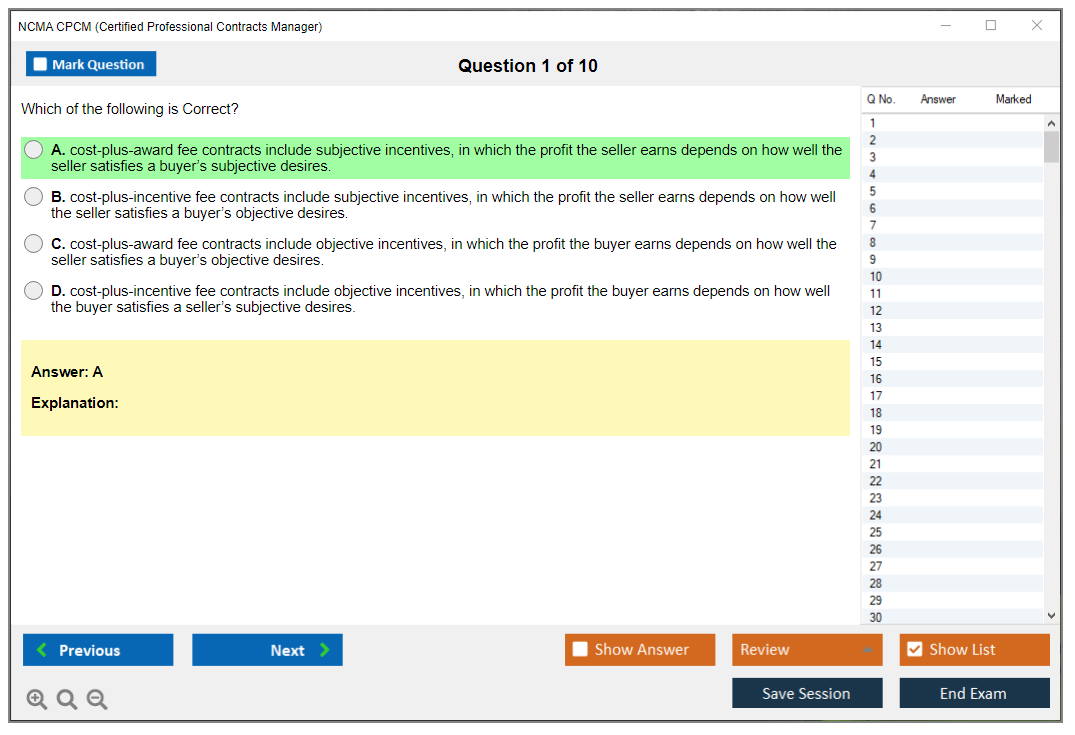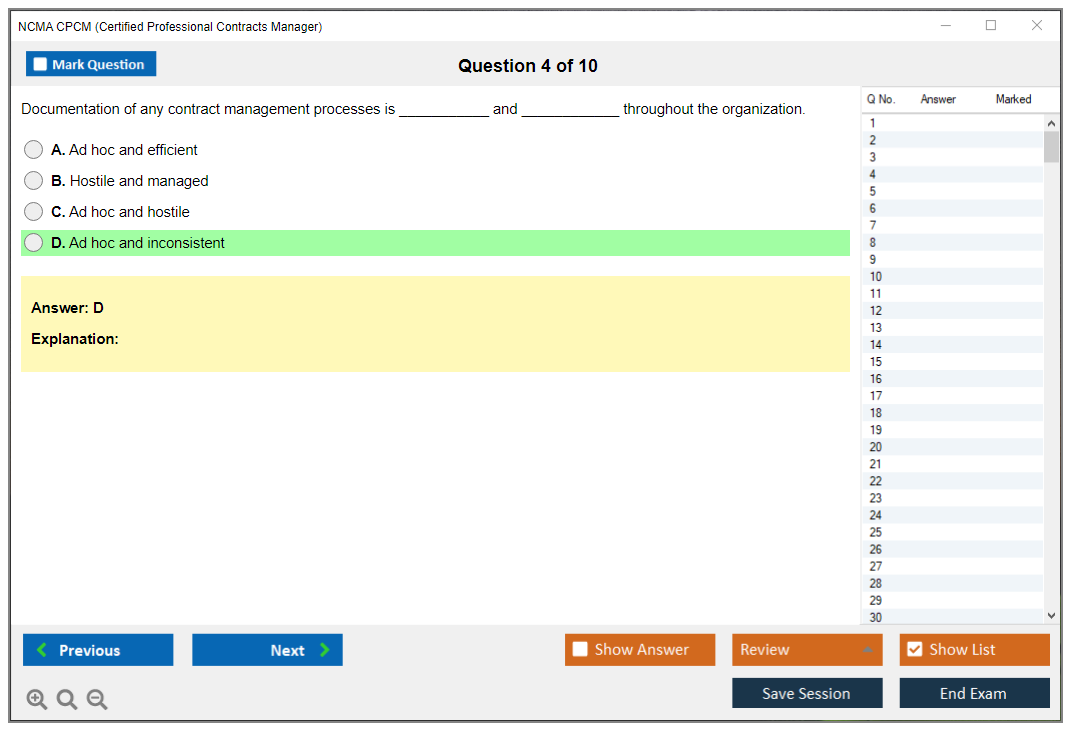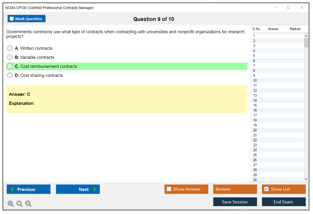 The NCMA Certified Professional Contracts Manager (CPCM) exam is a certification exam designed to validate a candidate's knowledge and skills in contract management. It is offered by the National Contract Management Association (NCMA) and is intended for professionals who manage contracts in various fields, including government and commercial sectors.