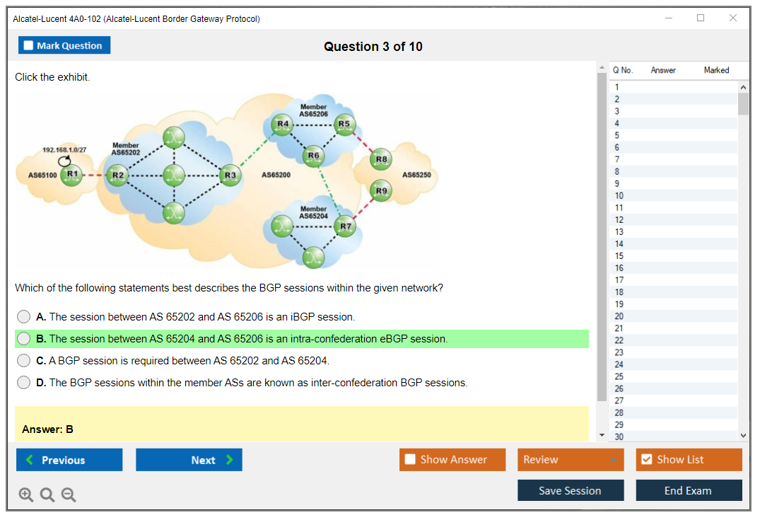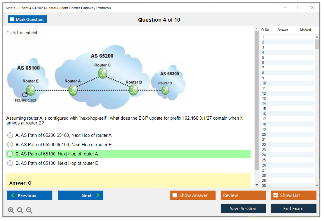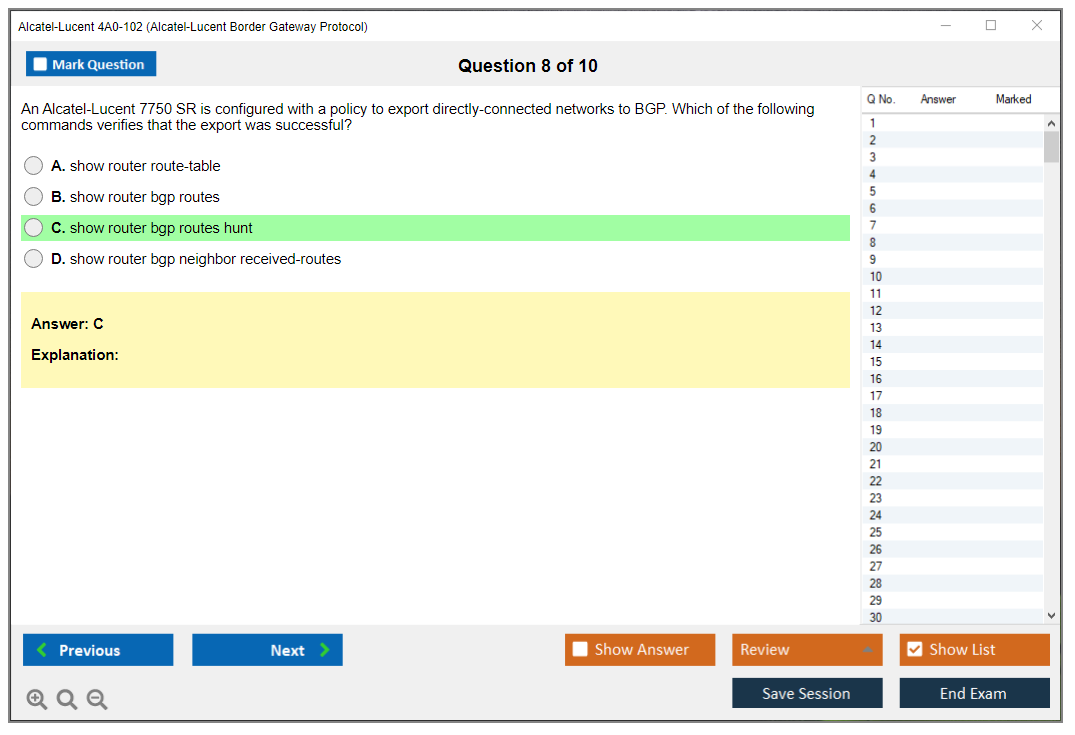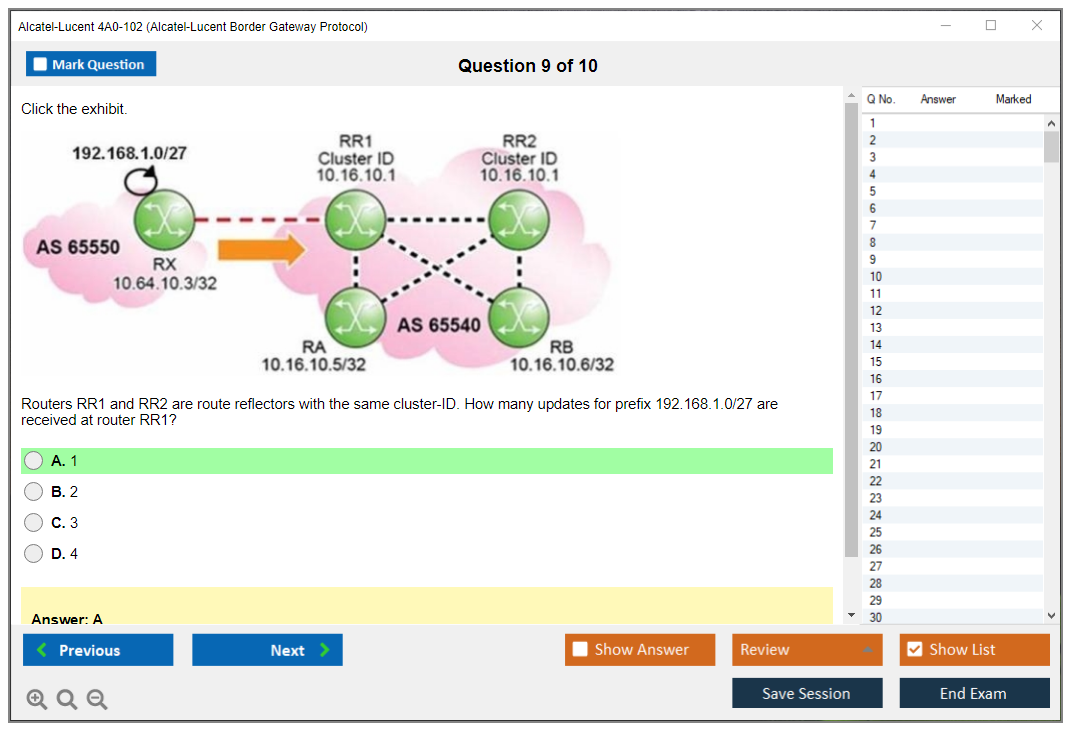 The Alcatel-Lucent 4A0-102 (Nokia Border Gateway Protocol) Exam is part of the Nokia Service Routing Certification (SRC) program. It focuses on the understanding and implementation of the Border Gateway Protocol (BGP) in IP networks.