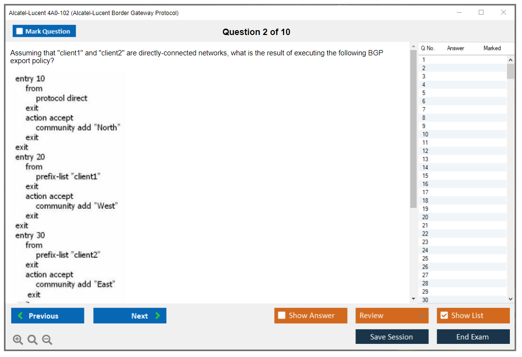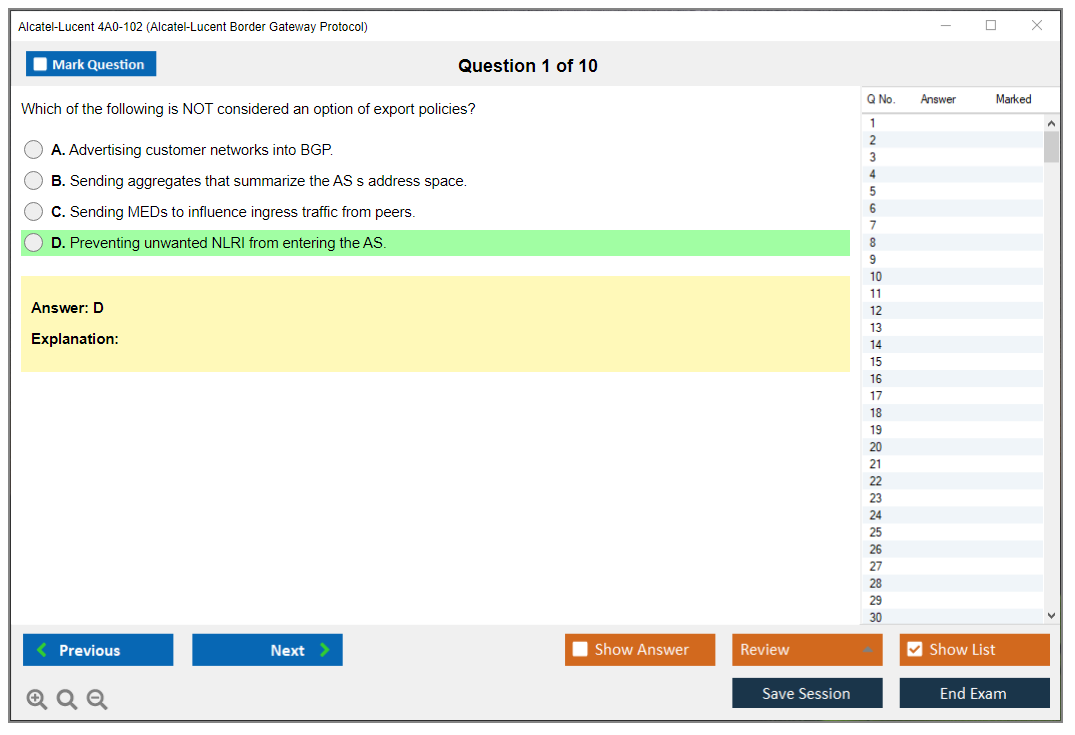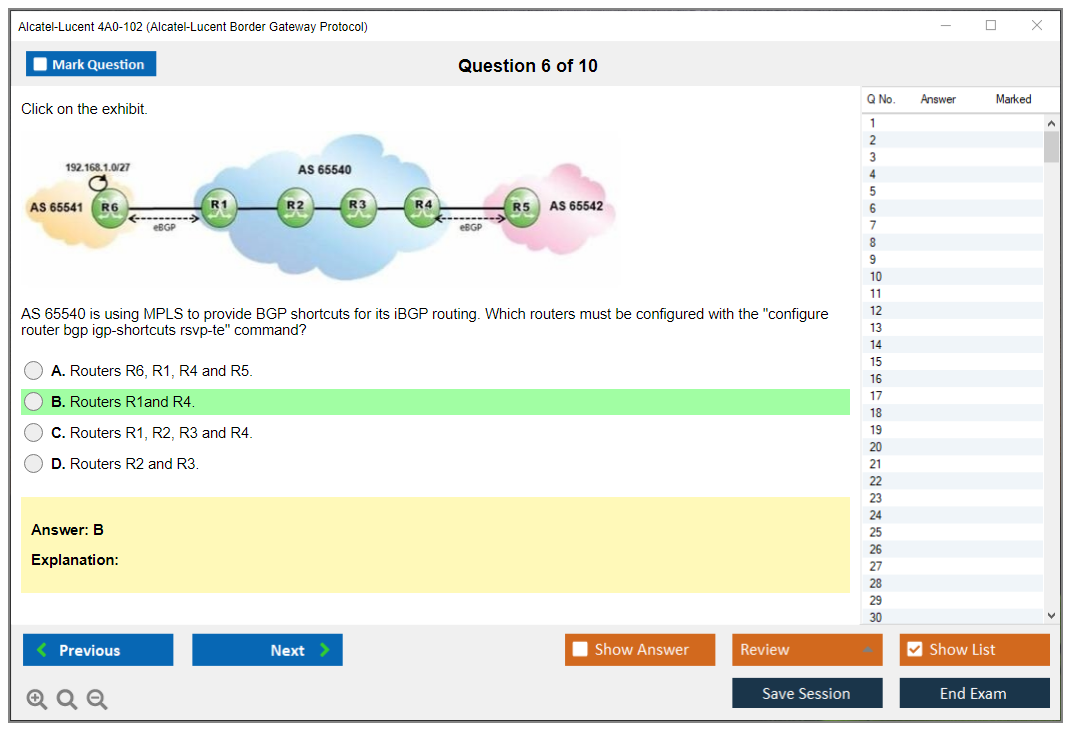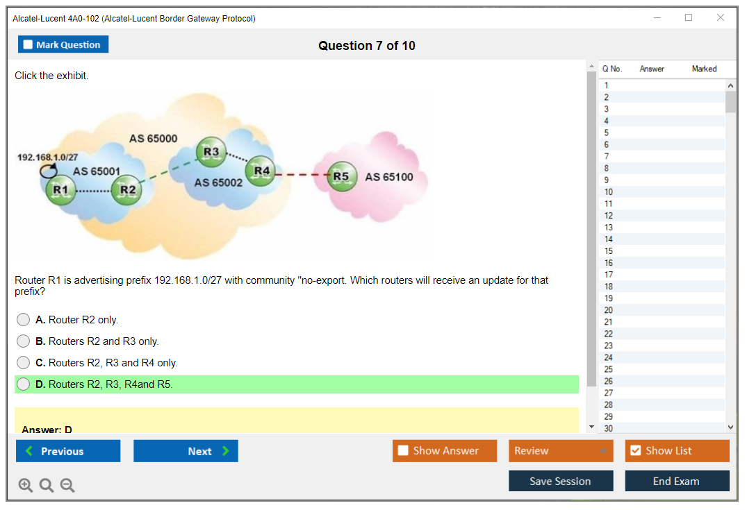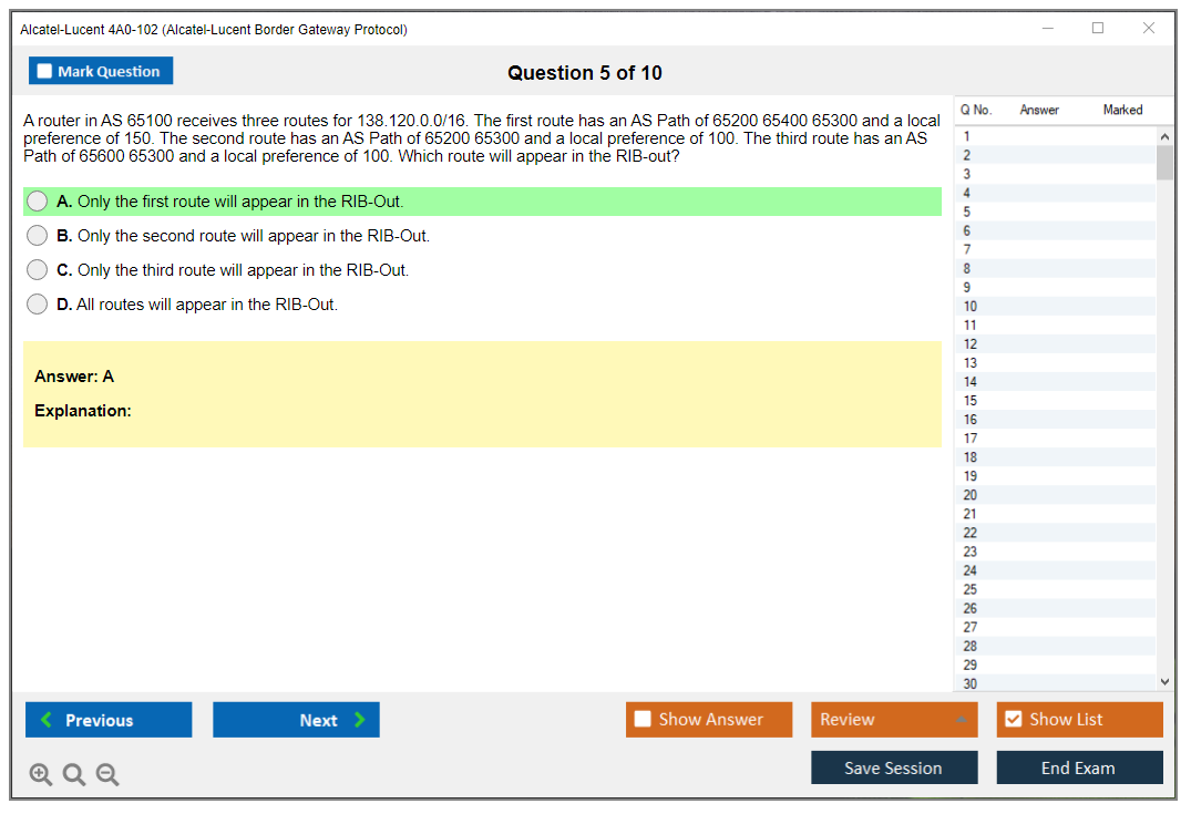 The Alcatel-Lucent 4A0-102 (Nokia Border Gateway Protocol) Exam is part of the Nokia Service Routing Certification (SRC) program. It focuses on the understanding and implementation of the Border Gateway Protocol (BGP) in IP networks.