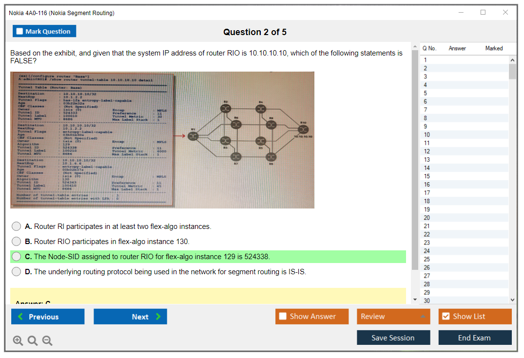 The Nokia 4A0-116 (Nokia Segment Routing Exam) is designed to test the knowledge and skills of individuals in segment routing concepts, implementation, and troubleshooting within Nokia networks.