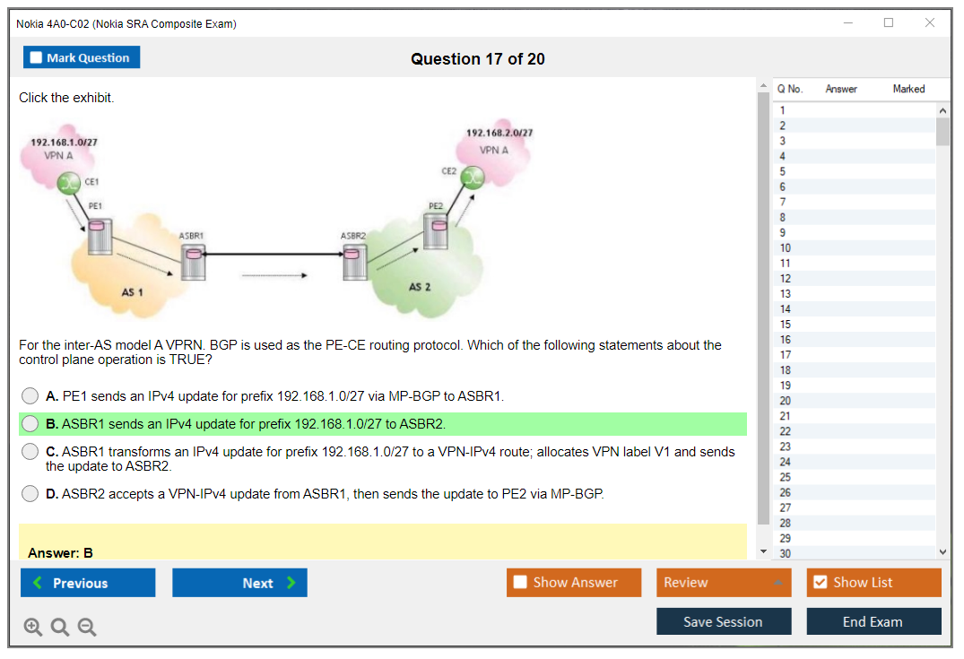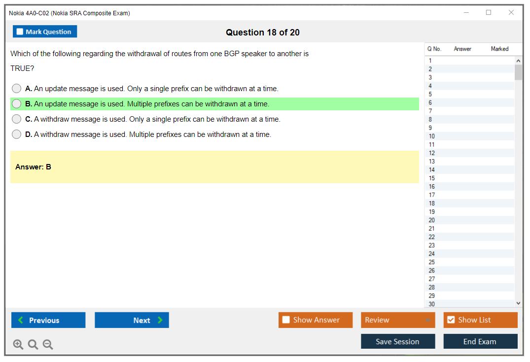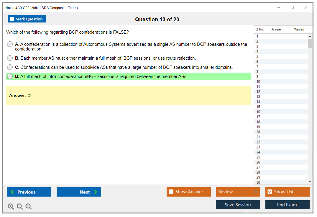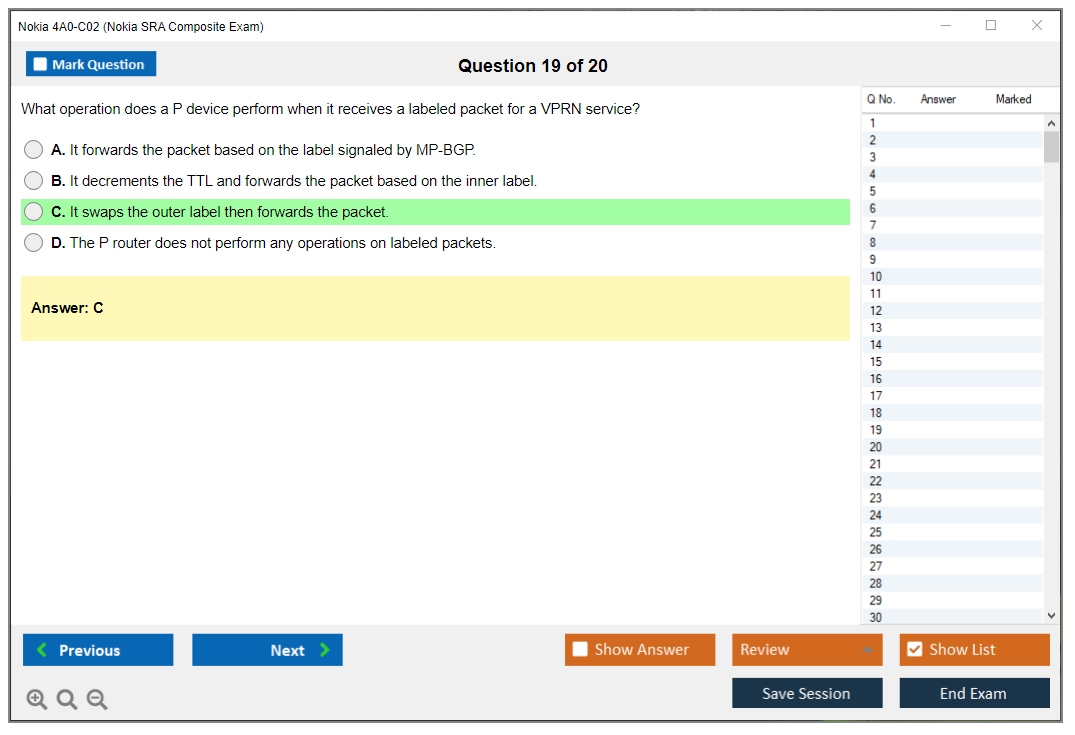 The Nokia 4A0-C02 Exam is a part of the Nokia Service Routing Certification (SRC) program, which is aimed at professionals who want to demonstrate their expertise in Nokia's IP and MPLS networks.
