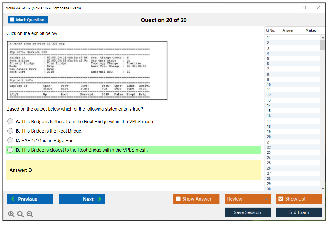 The Nokia 4A0-C02 (Nokia SRA Composite Exam) is a certification exam designed to validate the skills and knowledge required for professionals working with Nokia Service Routing Architecture. It covers a broad range of topics related to IP/MPLS networks and services.