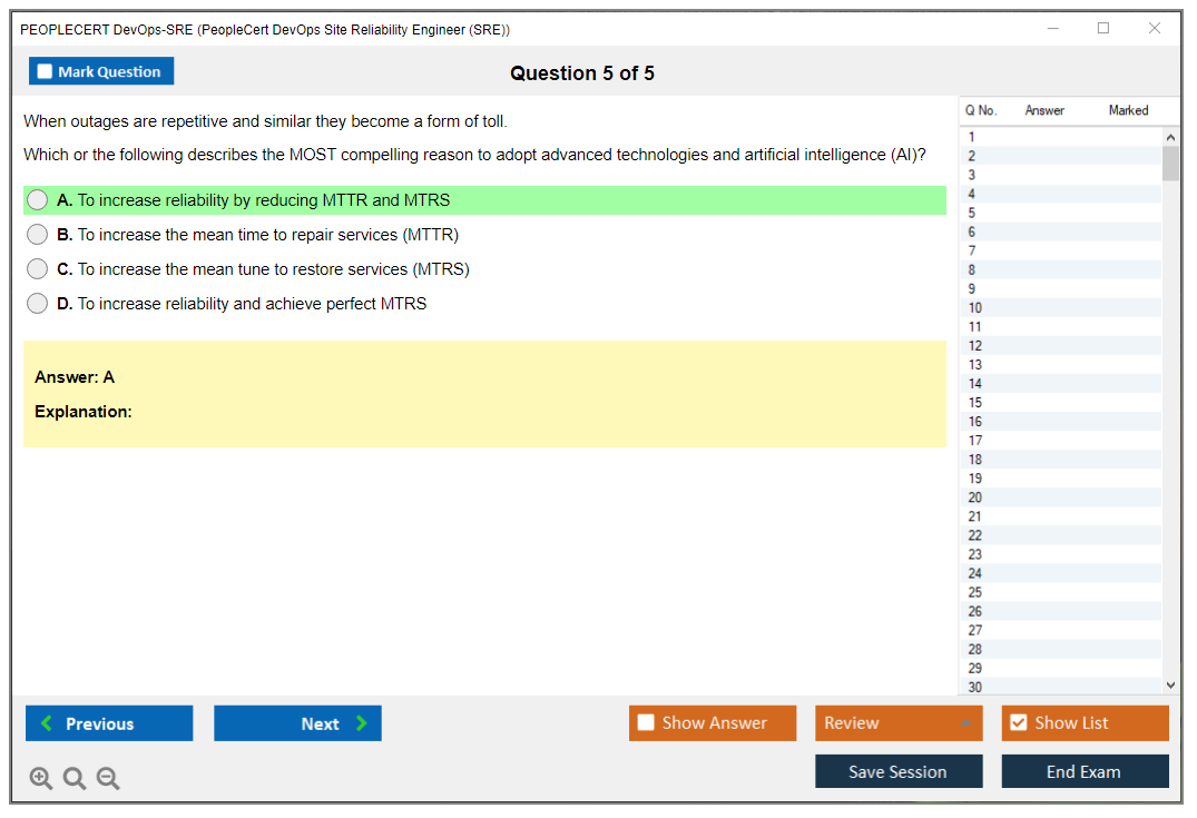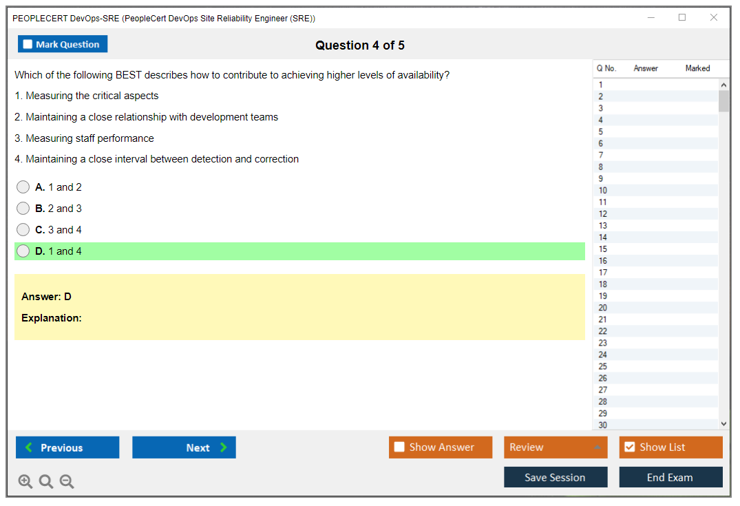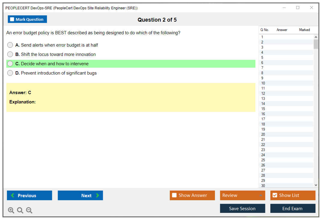 The PEOPLECERT DevOps-SRE (PeopleCert DevOps Site Reliability Engineer) Exam is designed to validate the skills and knowledge required for professionals to effectively perform the role of a Site Reliability Engineer in a DevOps environment. The exam covers topics such as reliability engineering, automation, monitoring, and incident response.