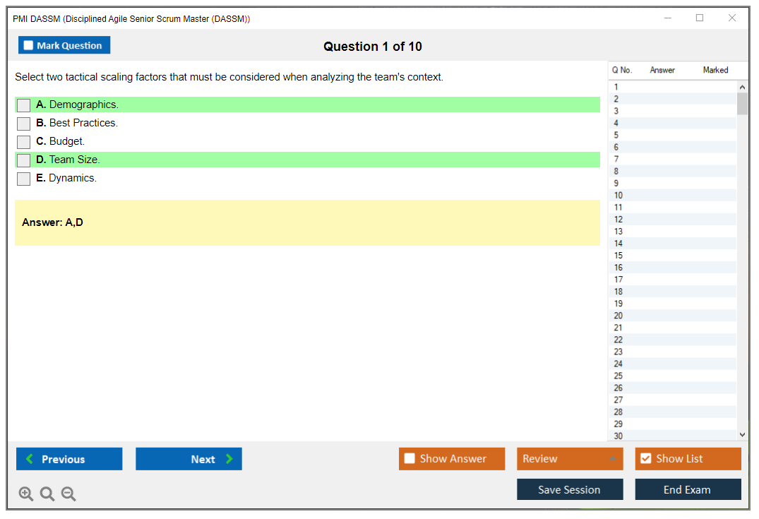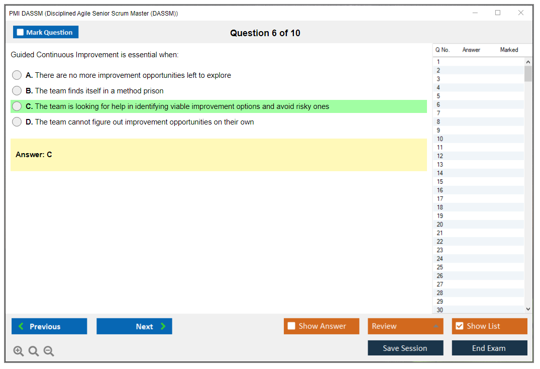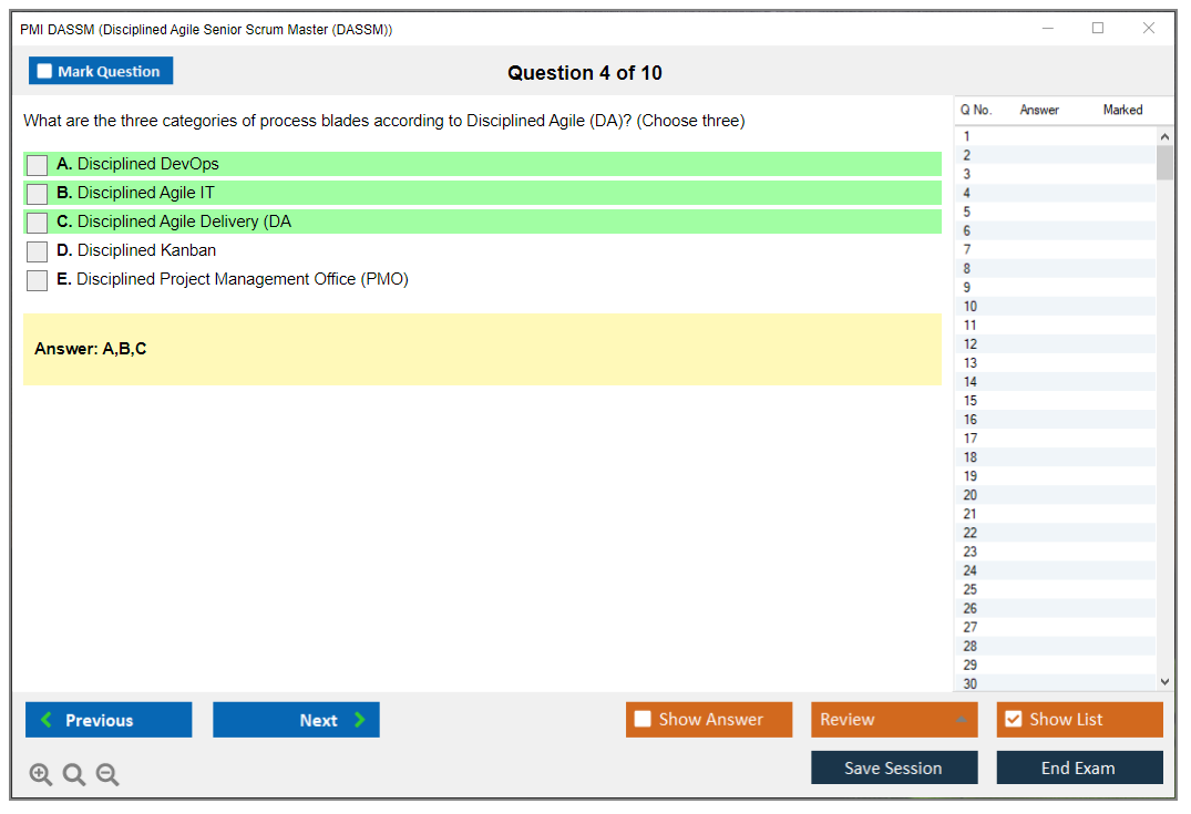 The PMI Disciplined Agile Senior Scrum Master (DASSM) Exam is an advanced certification exam offered by the Project Management Institute (PMI) for experienced Agile practitioners. It validates an individual's ability to lead Agile teams and projects using the Disciplined Agile toolkit.