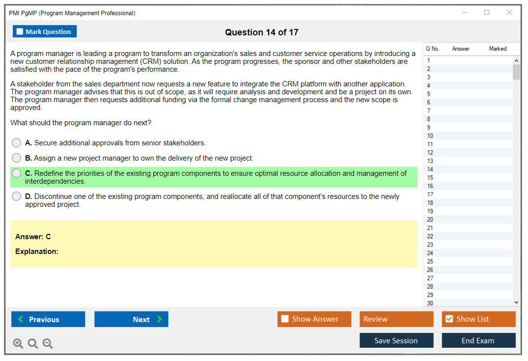 Sample questions for the PMI PgMP Exam can be found in the PMI's official PgMP Exam Content Outline and in various study guides and practice exam resources available online.